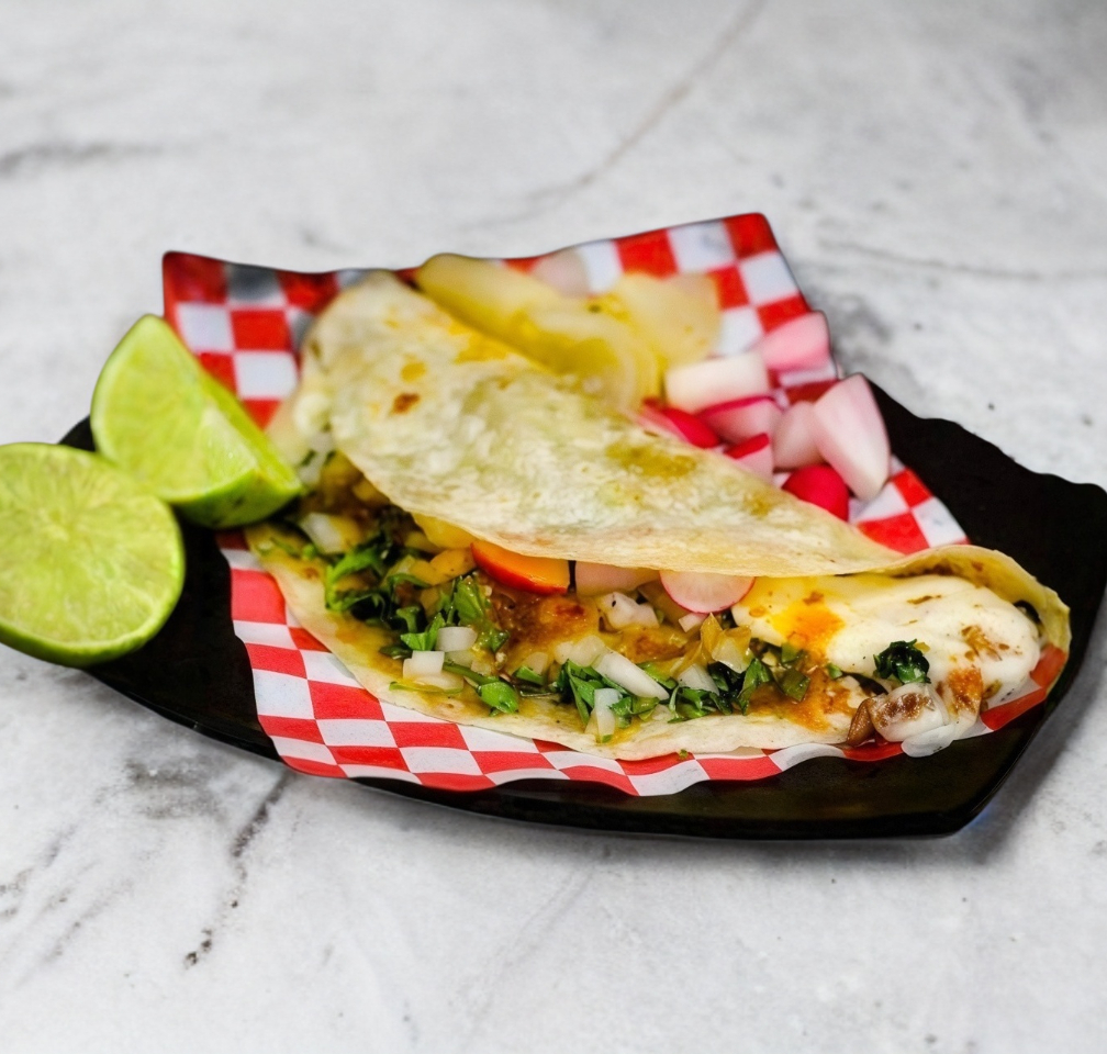Quesadilla dorada de masa de maiz adobada con chile guajillo, rellena de queso asadero, picadillo prensado chorizo o rajas y acompañada con guacamole