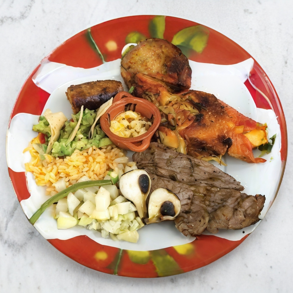 Jugoso corte acompañado de chorizo y guacamole