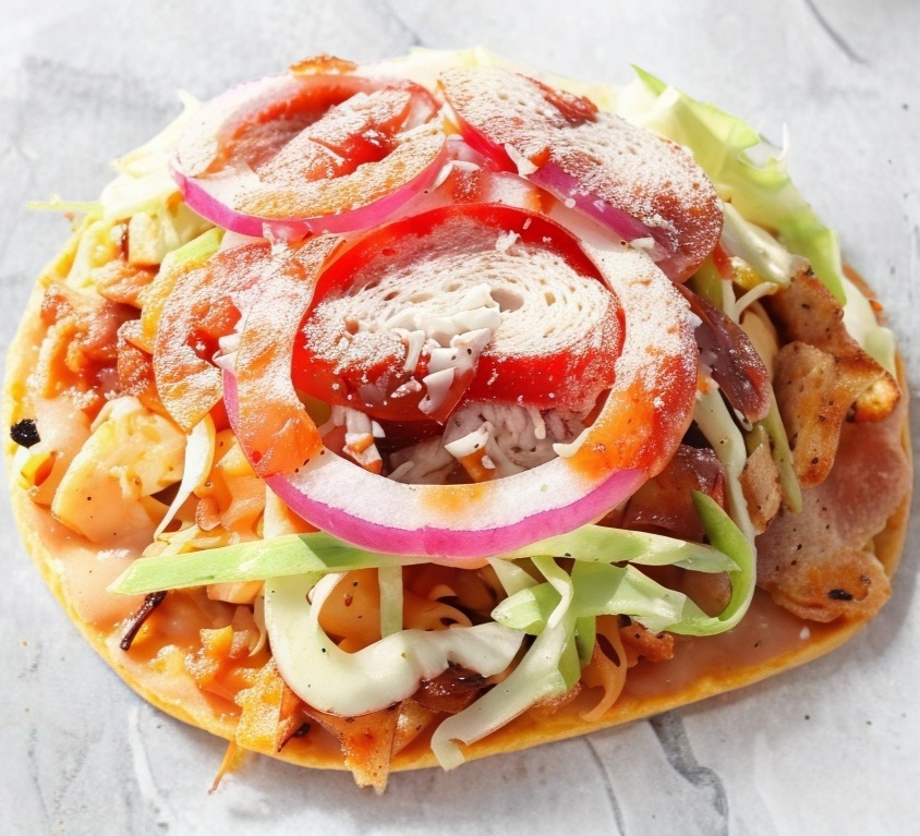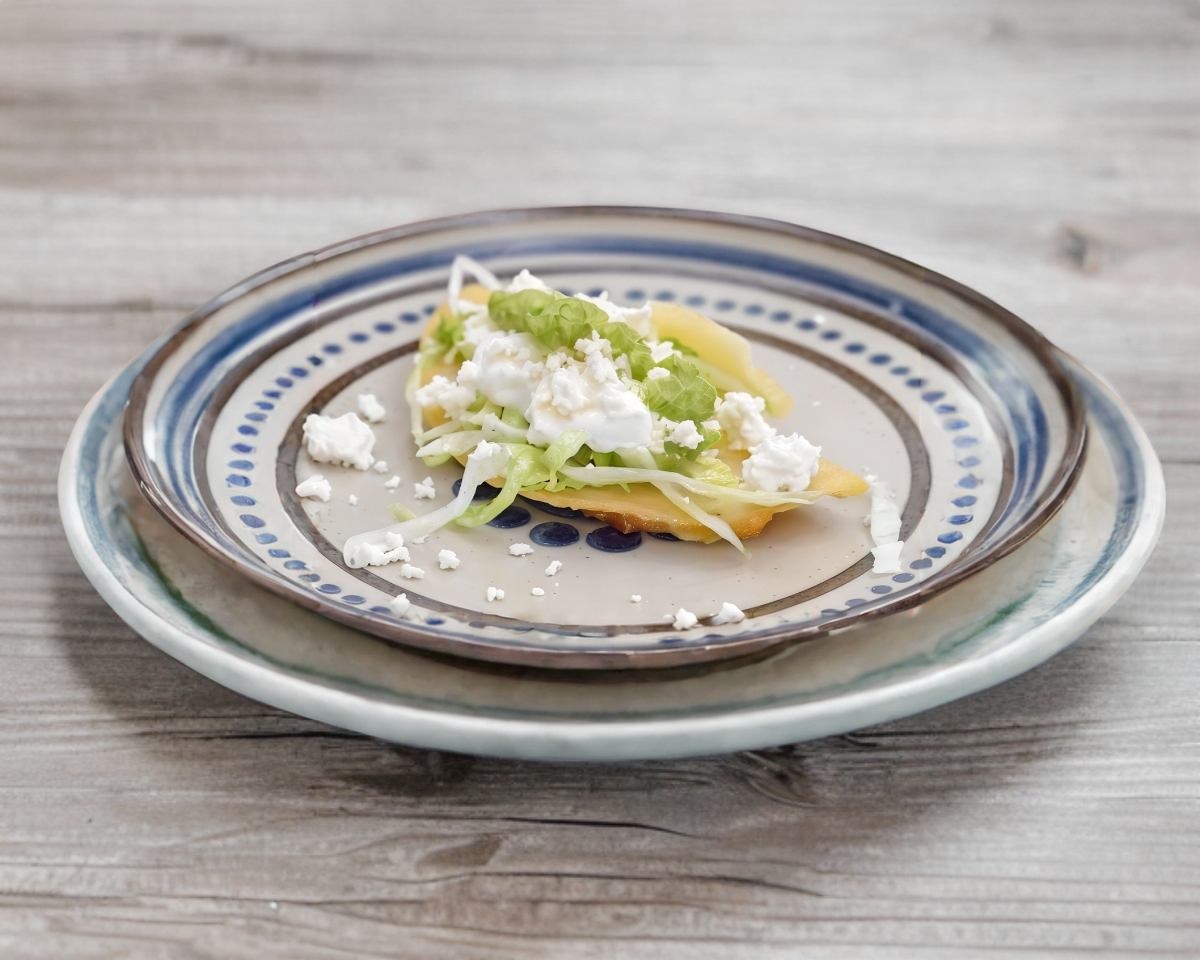 Tostada de la casa, recien dorada, pata, cueritos, zanahoria infurtida, papa infurtida, lechuga, jitomate cebolla crema queso añejo