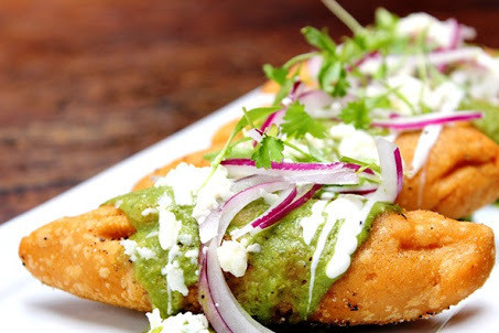 5 rellenas de papa o queso, las clasicas estilo aguascalientes, por fuera lechuga jitomate cebolla y crema