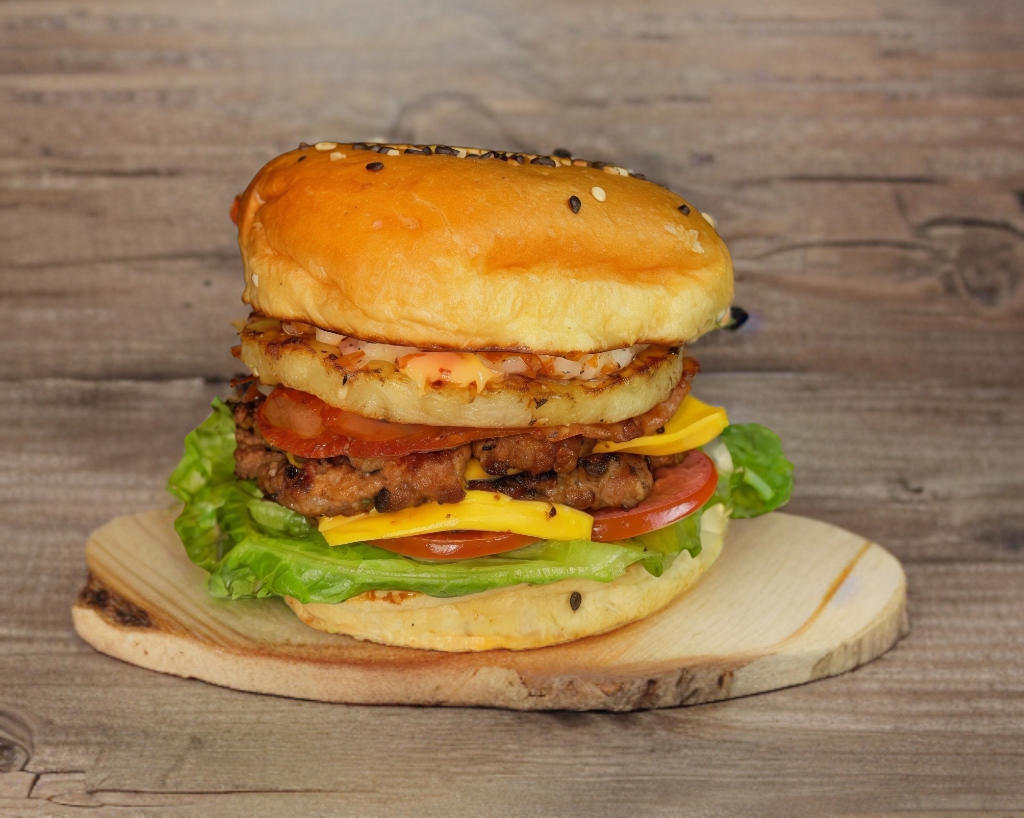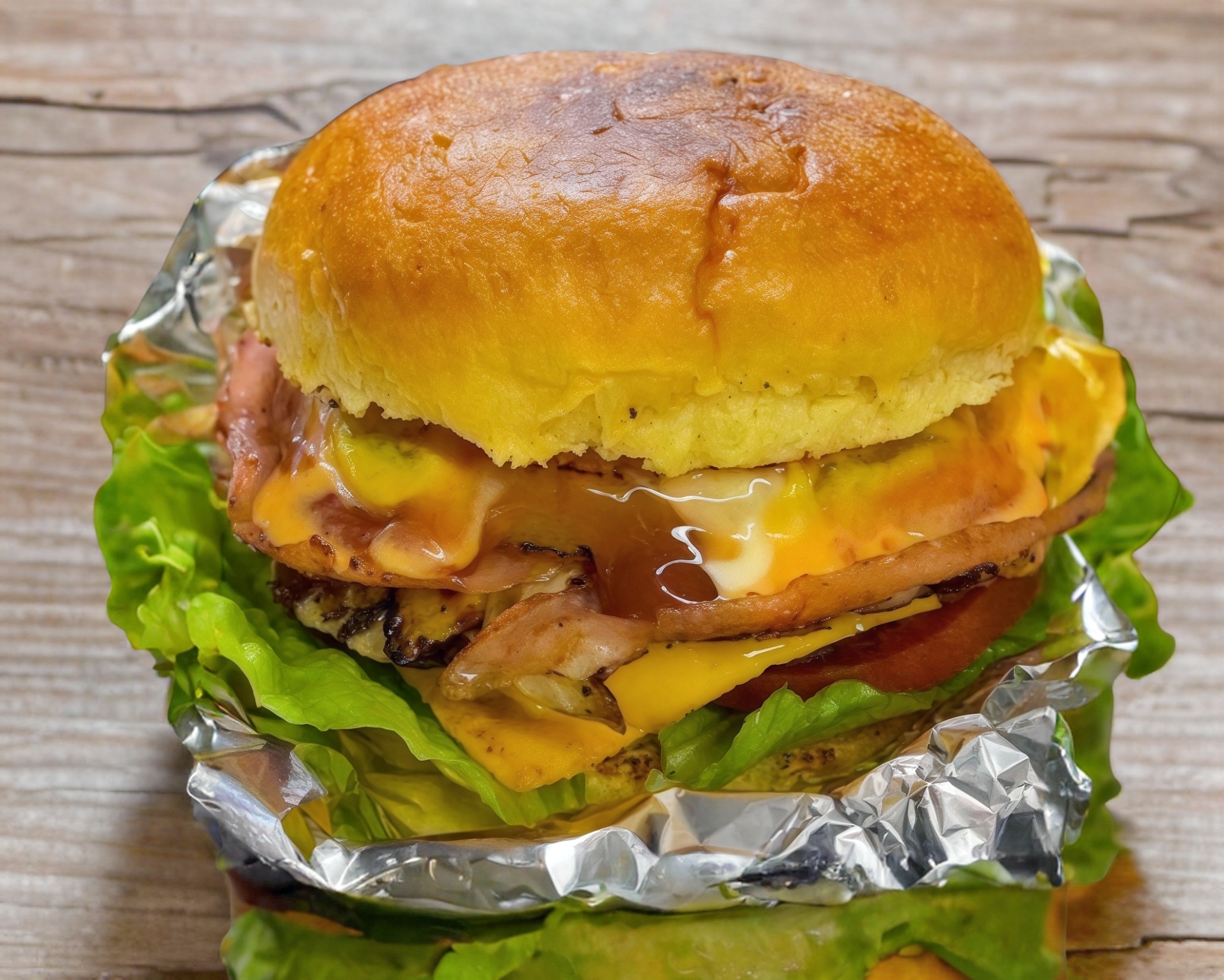 Carne de res de calidad, Pan artesanal, queso amarillo, doble queso asadero. jamon, lechuga italiana, jitomate, piña asada y aderezos