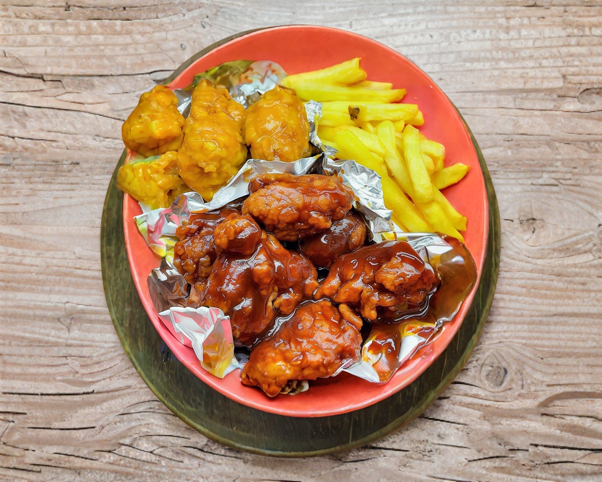 8 Piezas de Alitas de pollo bañadas en salsa(s) de tu preferencia con papas a la francesa incluidas y aderezos aparte (ranch, catsup y chimichurri)