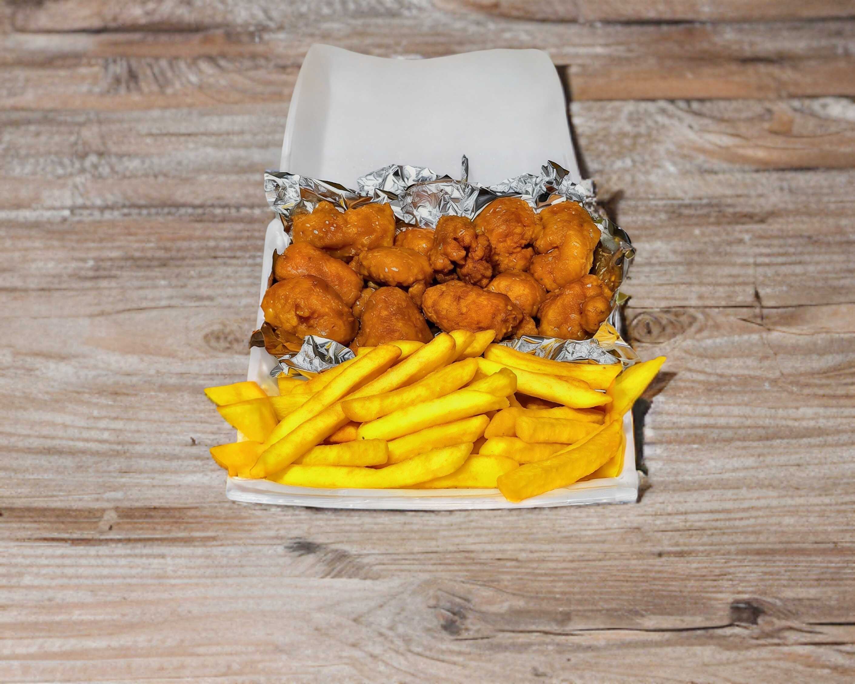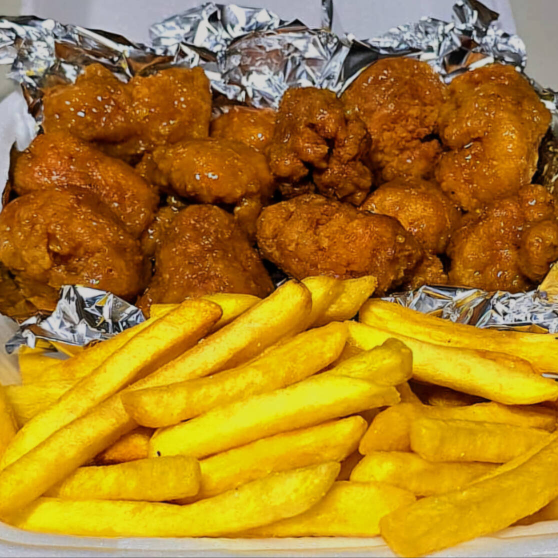 12 Piezas de Pechuga Empanizada bañada en salsa(s) de tu preferencia, con orden papas a la francesa incluidas y aderezos aparte (ranch, catsup y chimichurri)