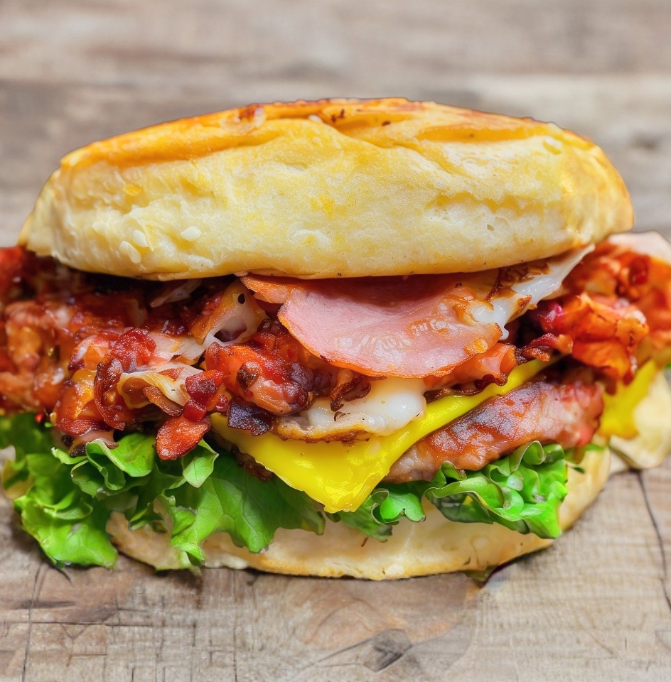 Carne de res de calidad, Pan artesanal, Chorizo, salchicha de pavo, queso amarillo, doble queso asadero. jamon, lechuga italiana, jitomate y aderezos