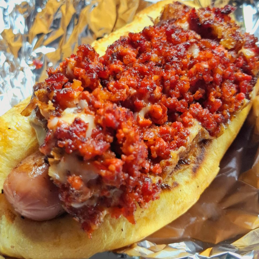 Salchicha de Pavo, Tocino, Queso Asadero, Pan Artesanal, jitomate, cebolla asada caramelizada y aderezos