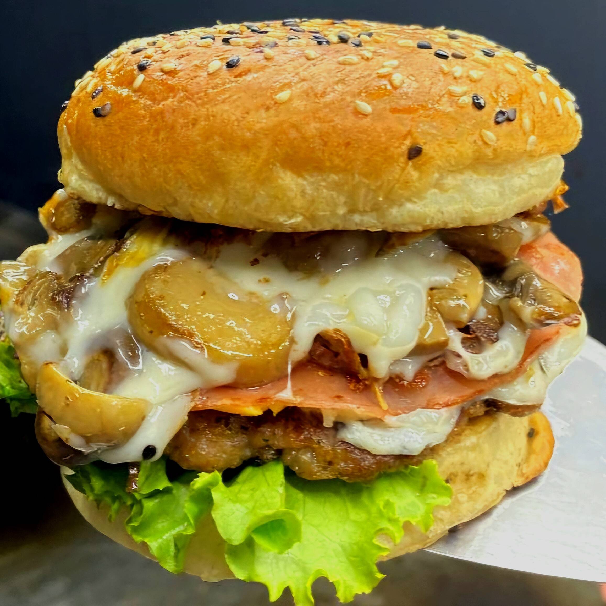 Carne de res de calidad, Pan artesanal, queso amarillo, doble queso asadero, jamón, lechuga italiana, jitomate, champiñones asados y aderezos