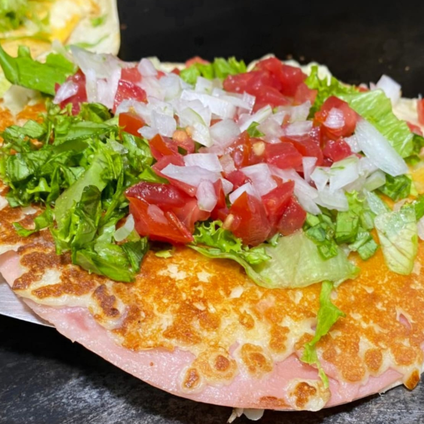 Doble Tortilla de Harina, Queso Asadero, Queso Amarillo, Jamón, Verdura y Aderezos