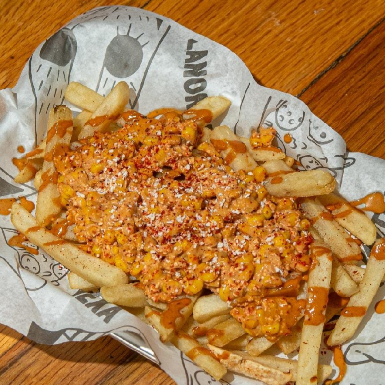 Papas con elote amarillo, mayonesa de chipotle, queso y chips fuego. El crunch más explosivo.