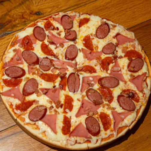 Tocino crujiente, salchicha de res, jamón y pepperoni sobre queso fundido. Una bomba de sabor para los verdaderos carnívoros 🤤