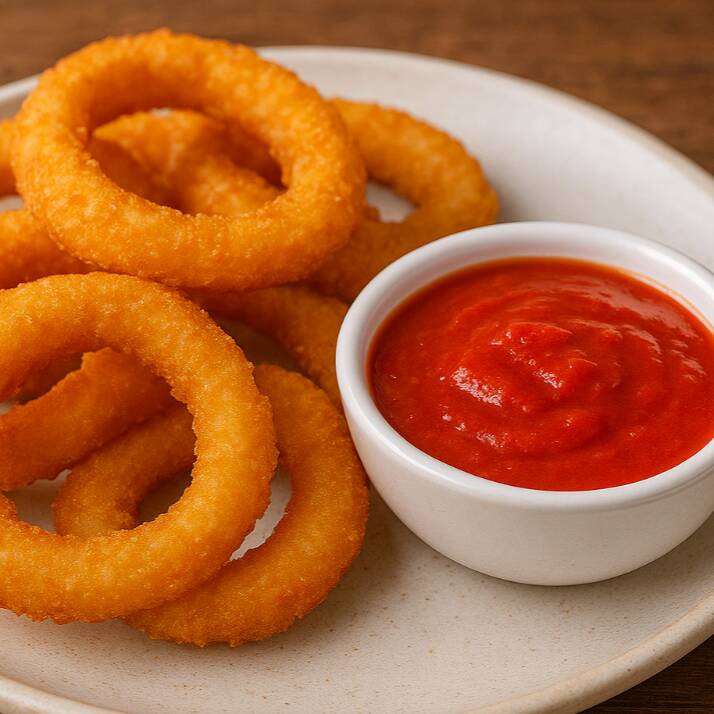 Aros dorados y crujientes con dip de salsa de tomate. El snack crujiente que estabas buscando.