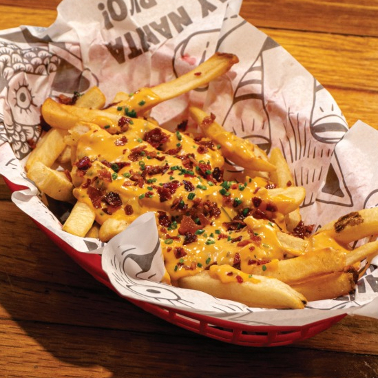 Papas a la francesa con queso amarillo fundido y el aderezo Out. ¡Solo aquí las encuentras!