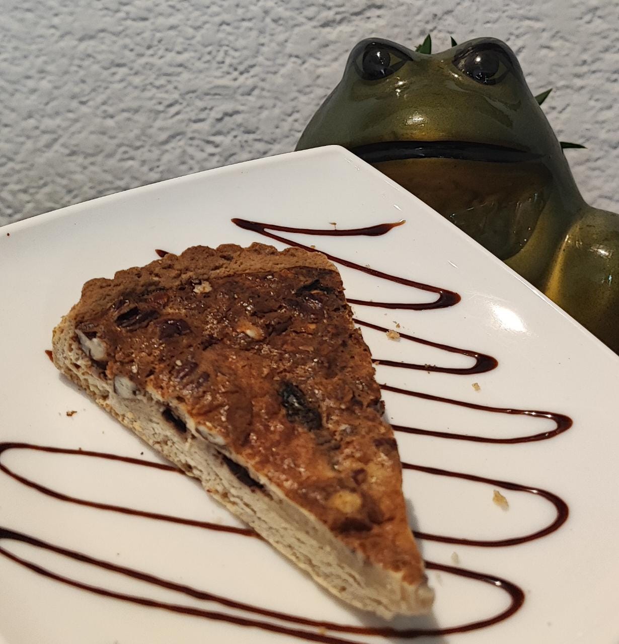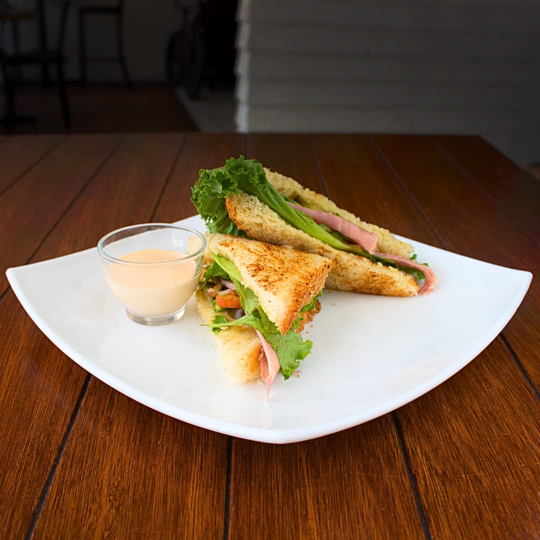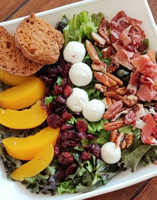 Lechuga, espinaca, jamón serrano, nuez, queso de cabra, arándanos, durazno y aderezo de jengibre balsámico.