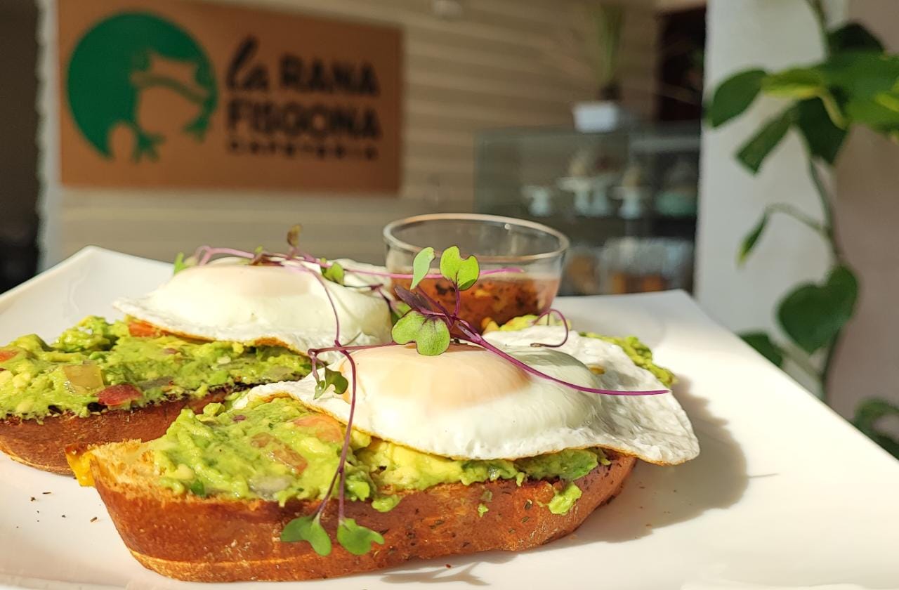 Pan artesanal, nuestro delicioso guacamole y 2 huevos estrellados.