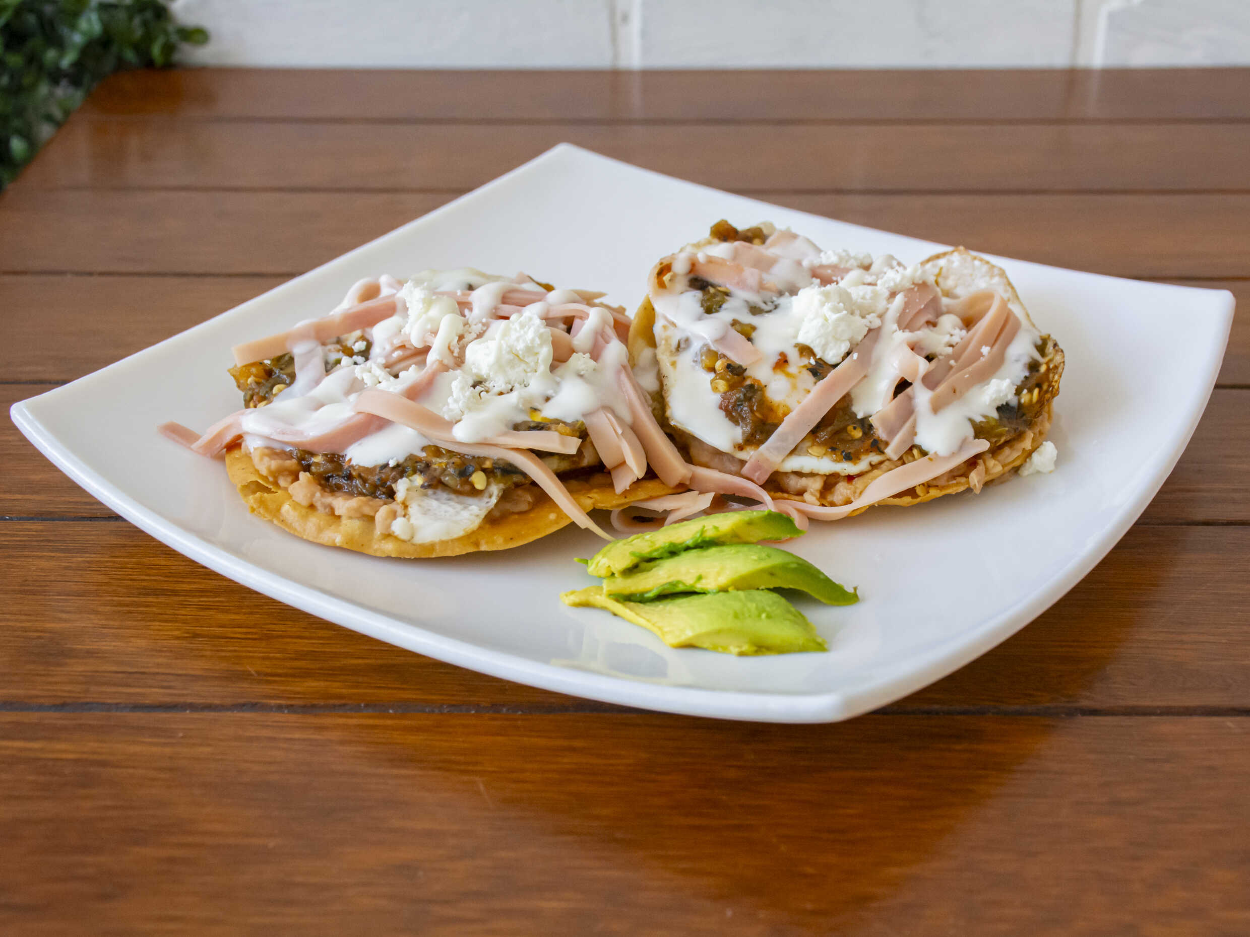 Montados en una tortilla doradita untada con frijoles, bañados en salsa martajada con un toque de crema, acompañados de aguacate, jamón y queso panela.