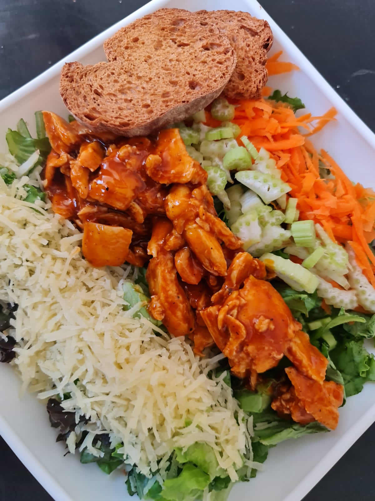 Lechuga, cebolla, apio, zanahoria, queso parmesano, pollo en salsa buffalo y aderezo de la casa.