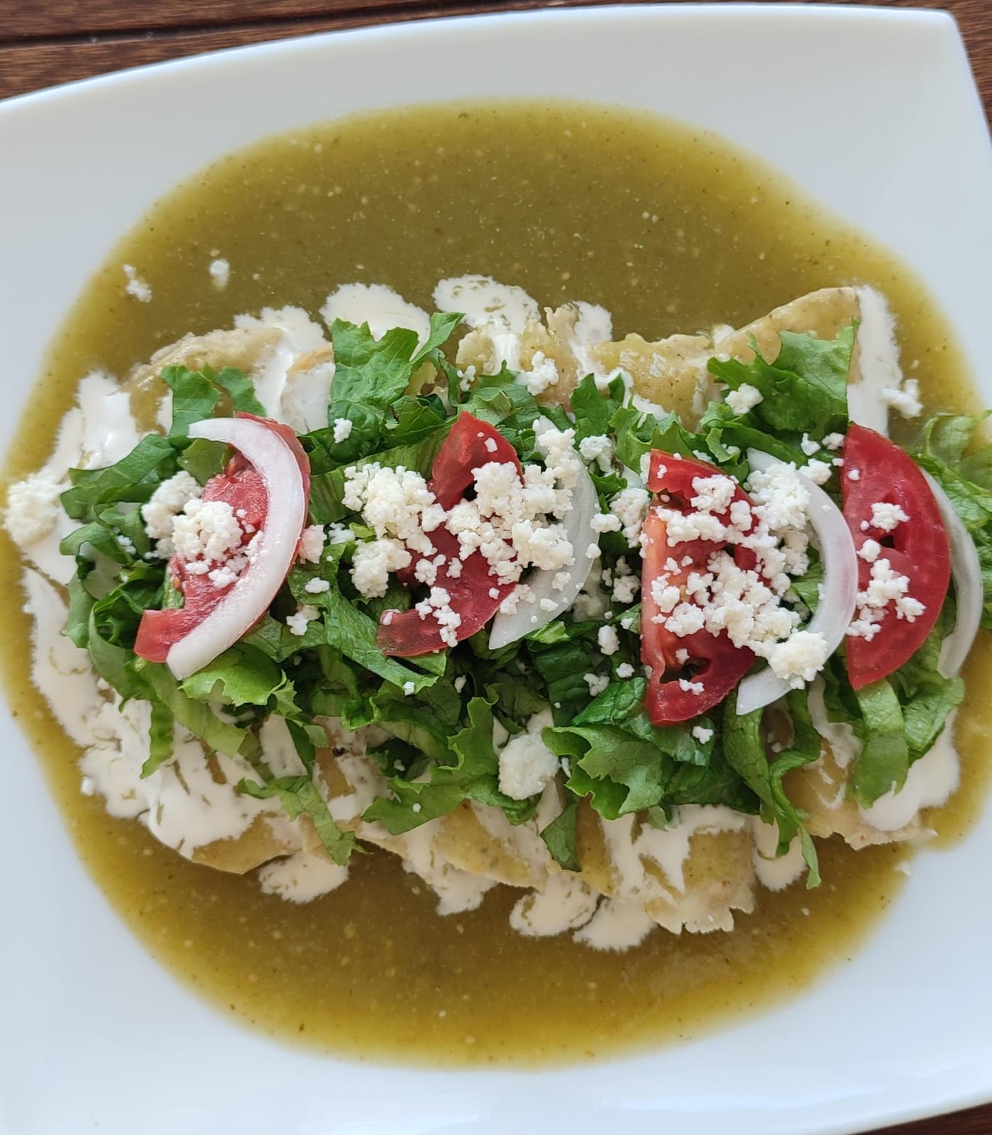 Enchiladas de pollo y queso con nuestra deliciosa salsa verde.