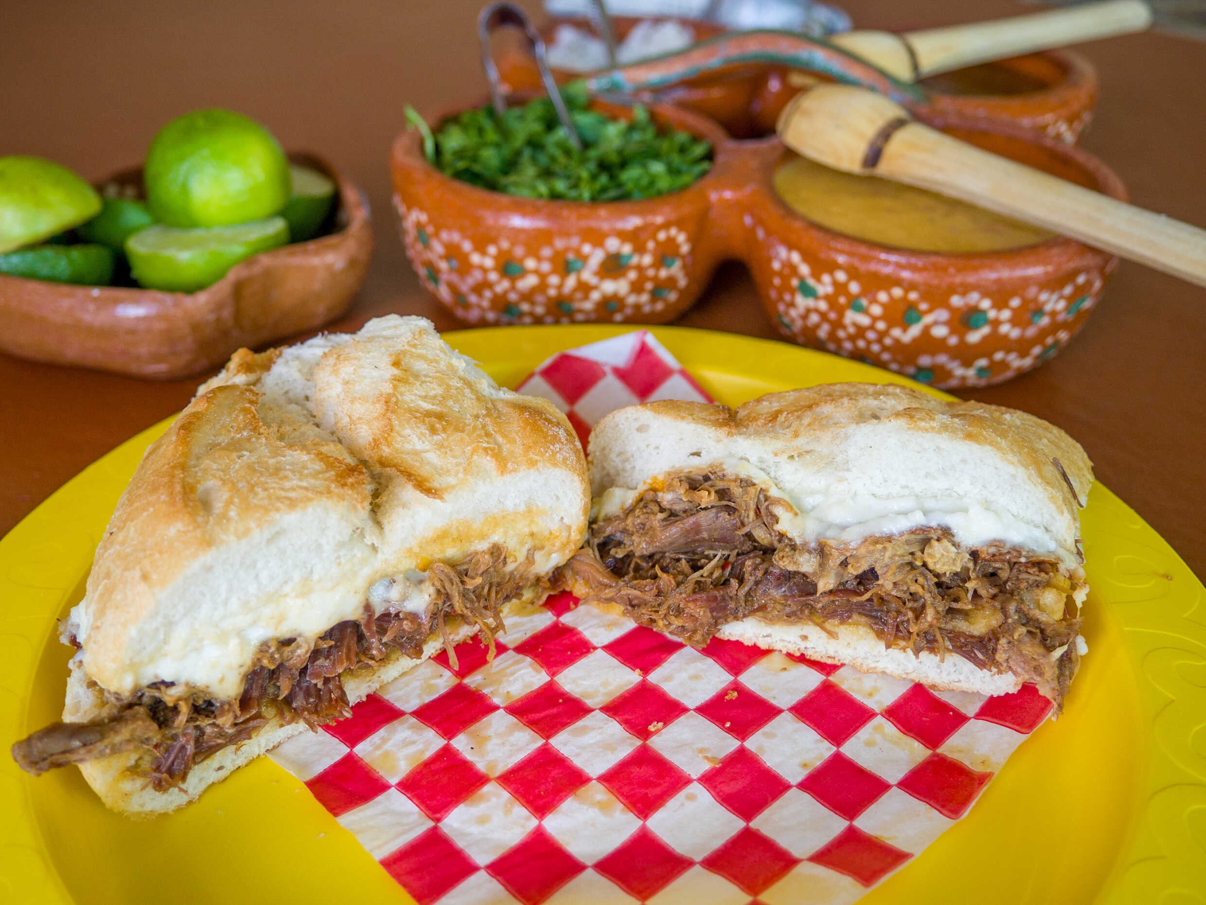 Bolillo crujiente con jugosa barbacoa de res y queso artesanal