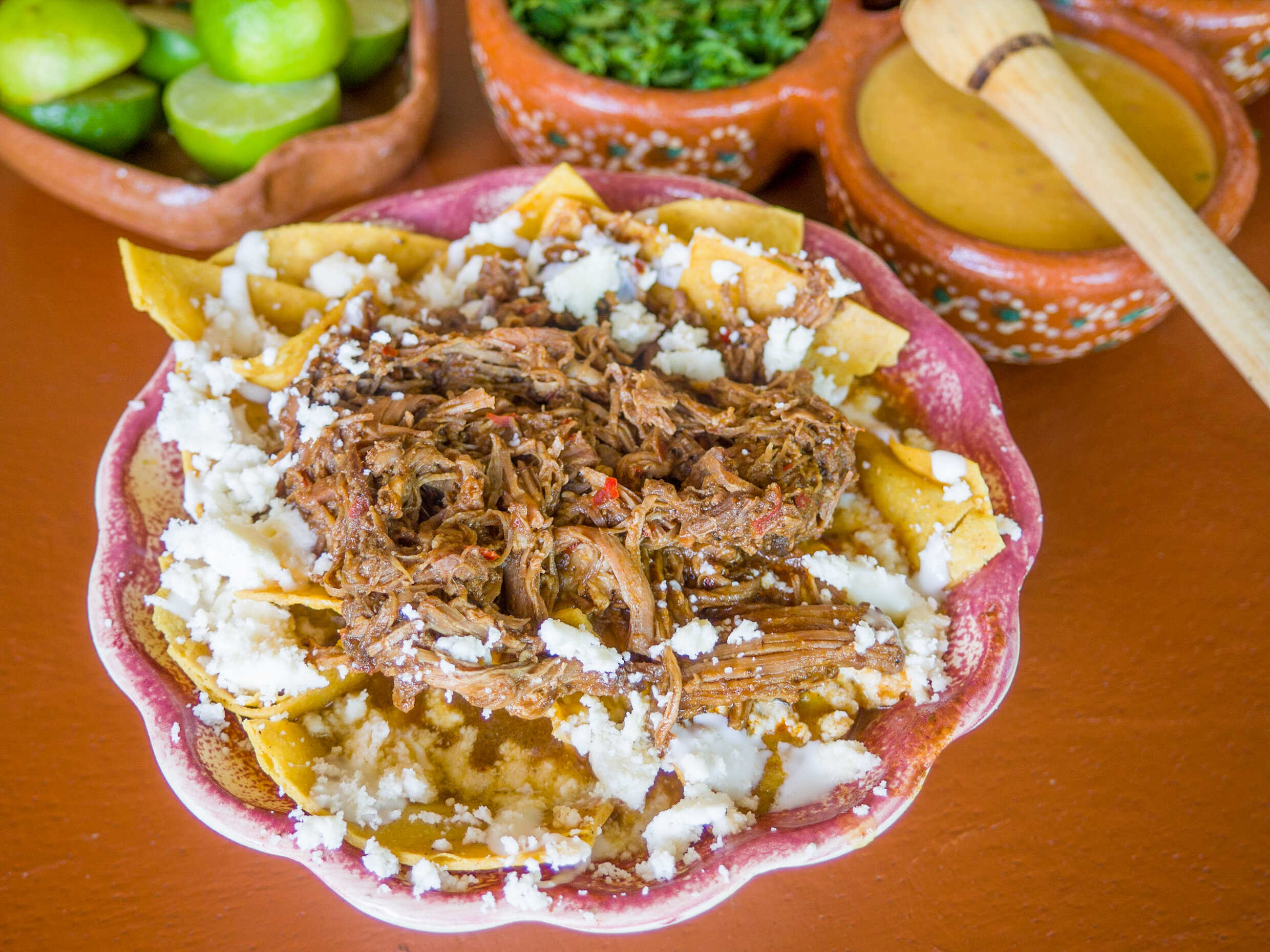 Chilaquiles en salsa borracha con barbacoa de res.