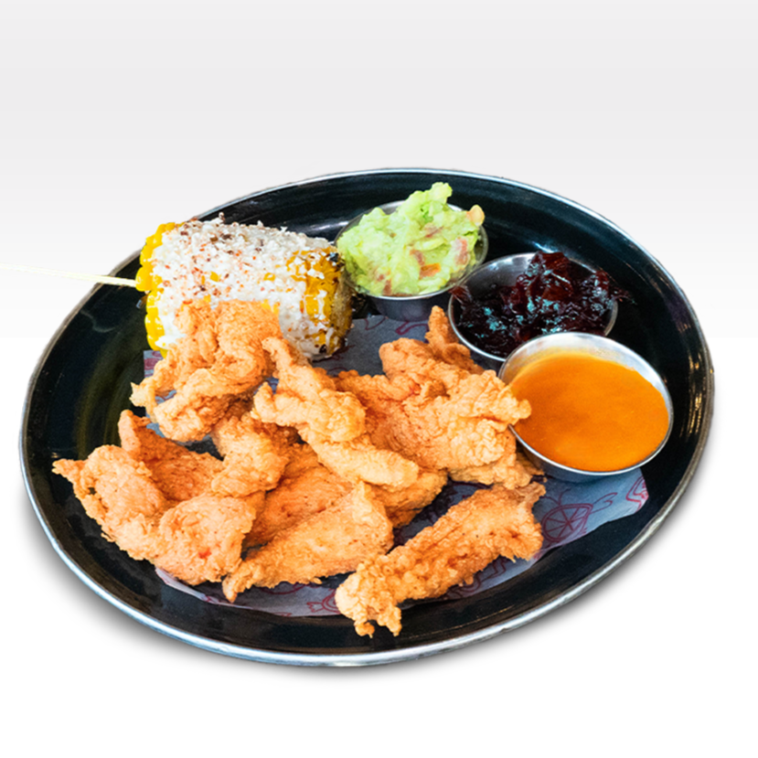 Súper crujientes tiritas de pechuga de pollo (300 g) con empanizado spicy, servido con salsa a elección y cebollita sazonada. Guarniciones de guacamole y elotito preparado.