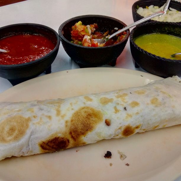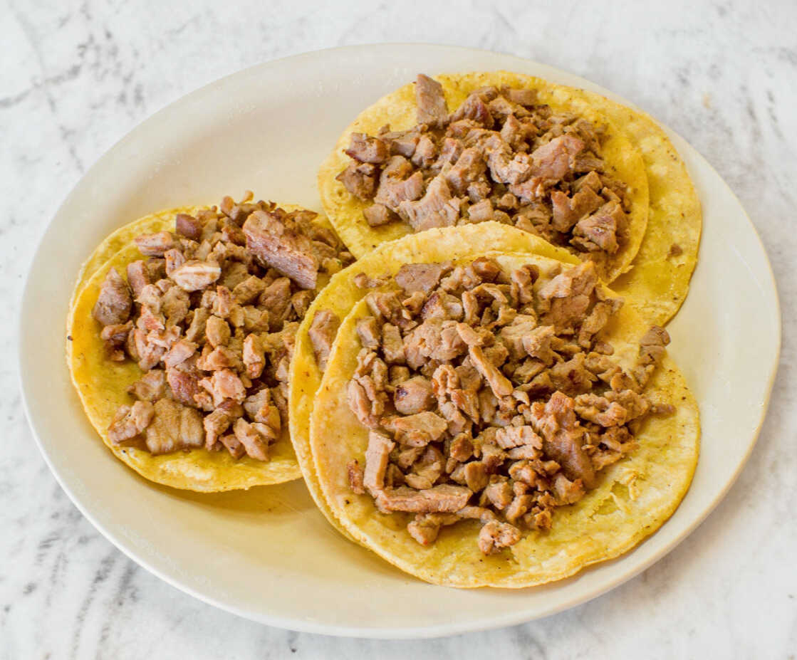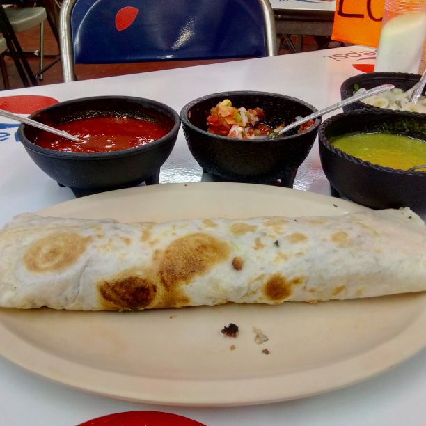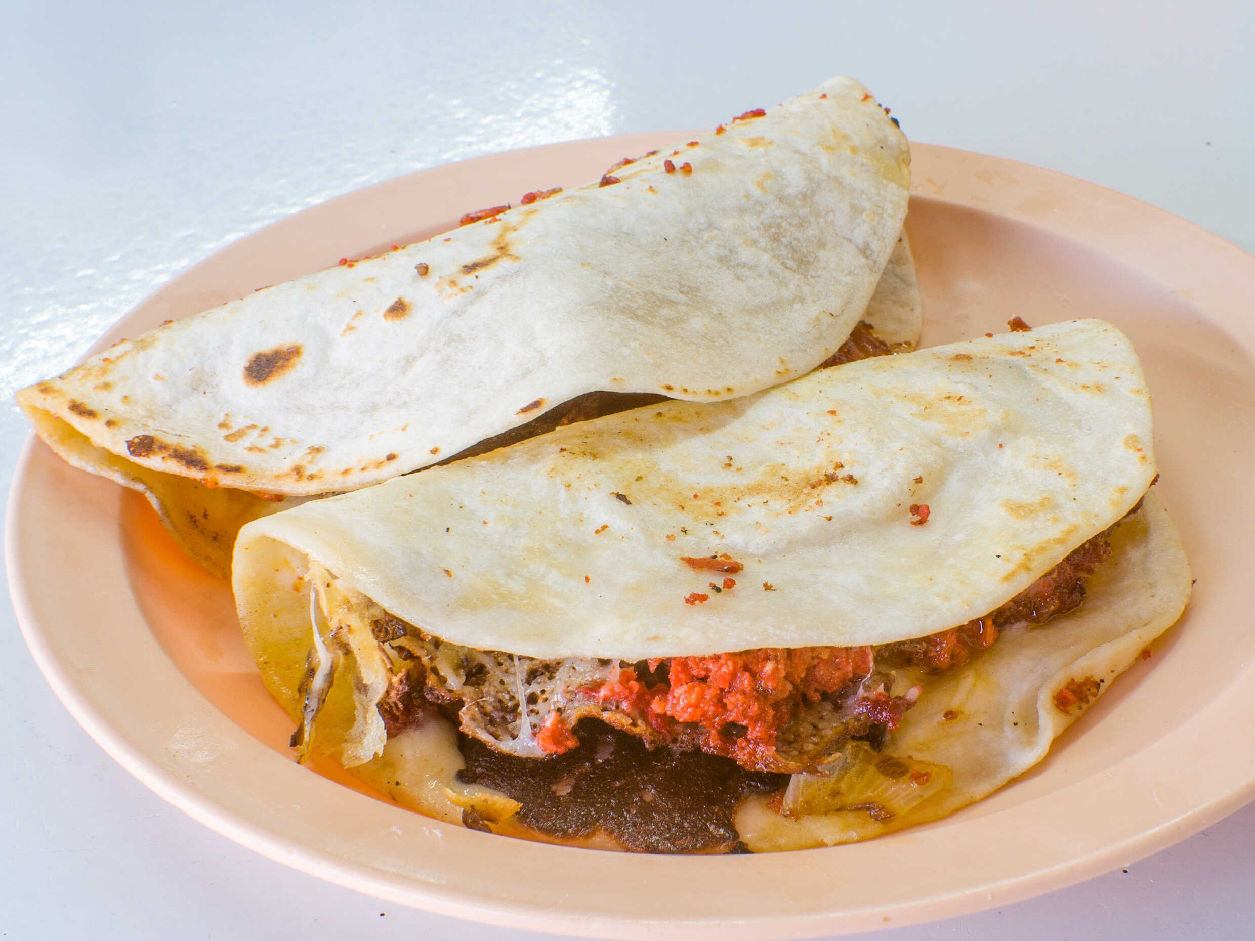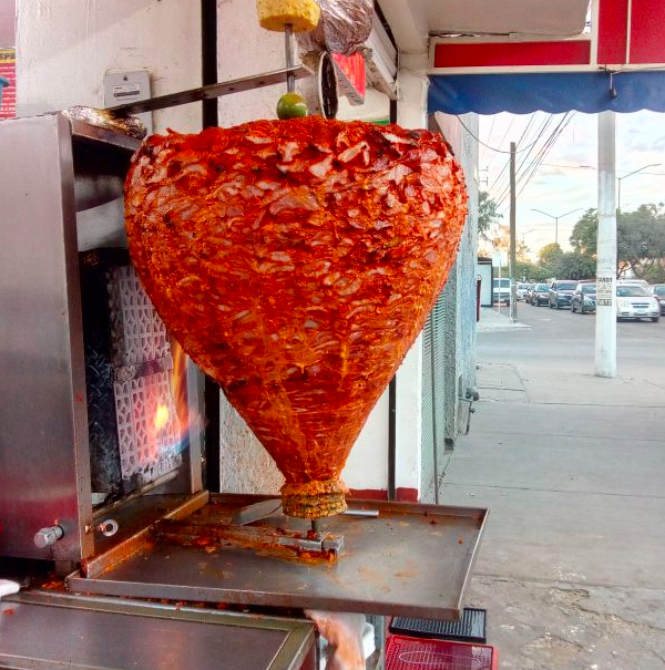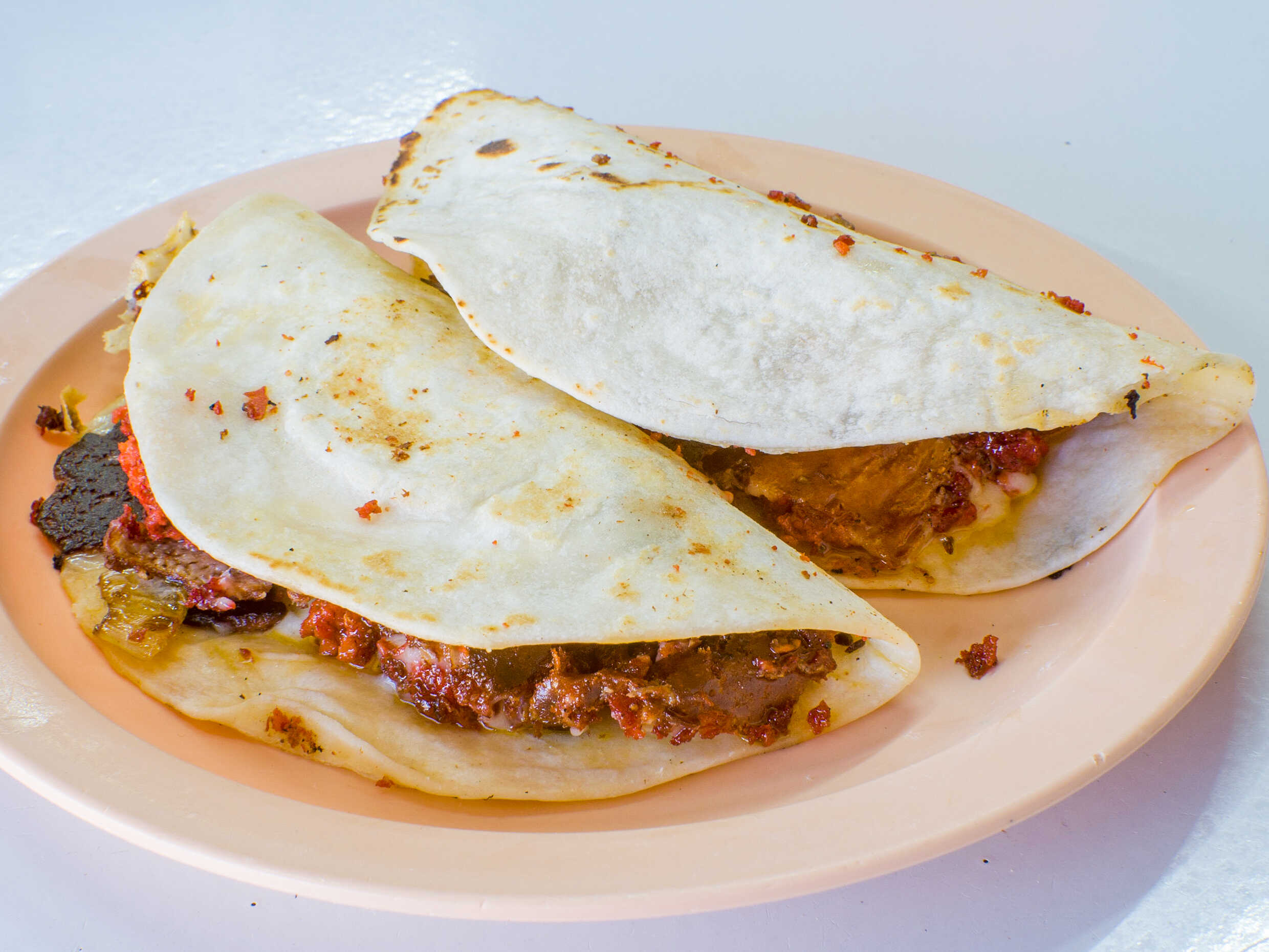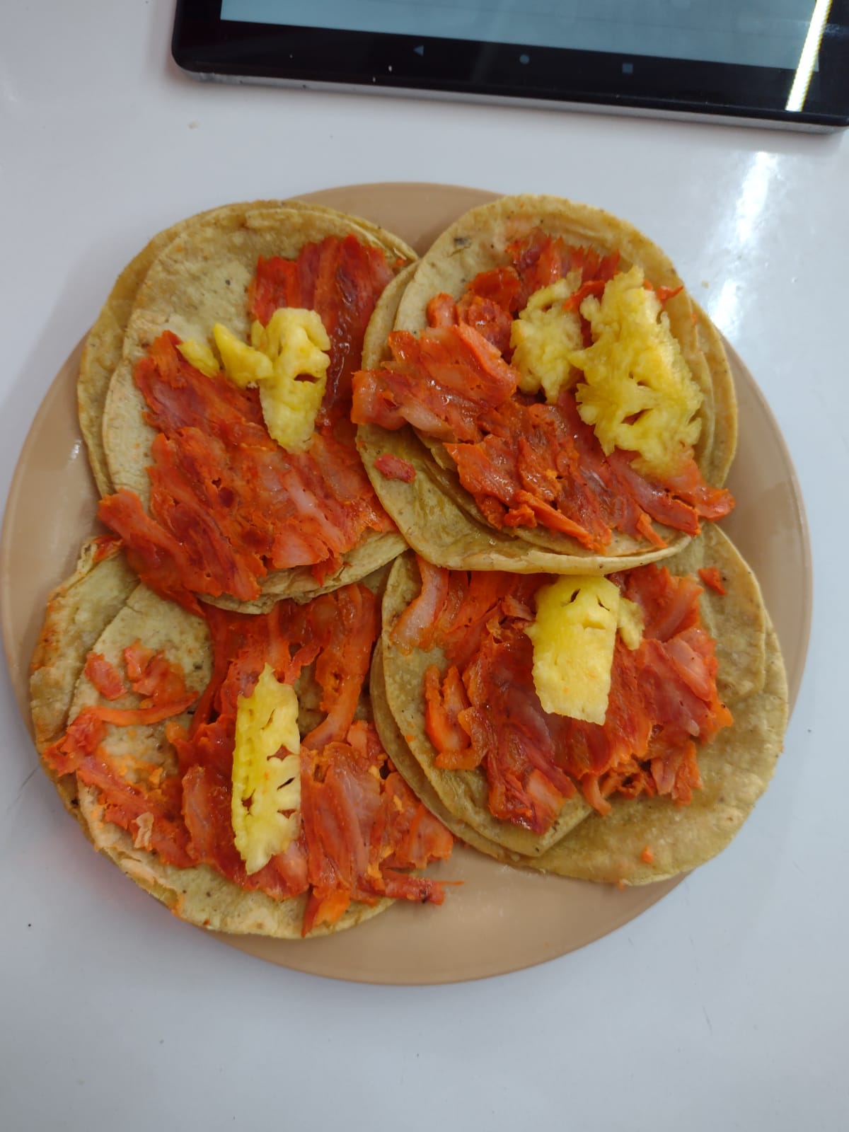 Tortilla de harina grande con pastor chorizo, jamón y queso.