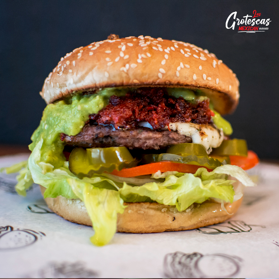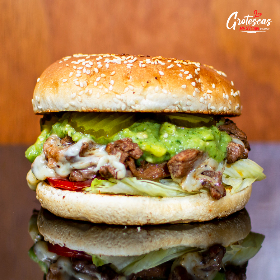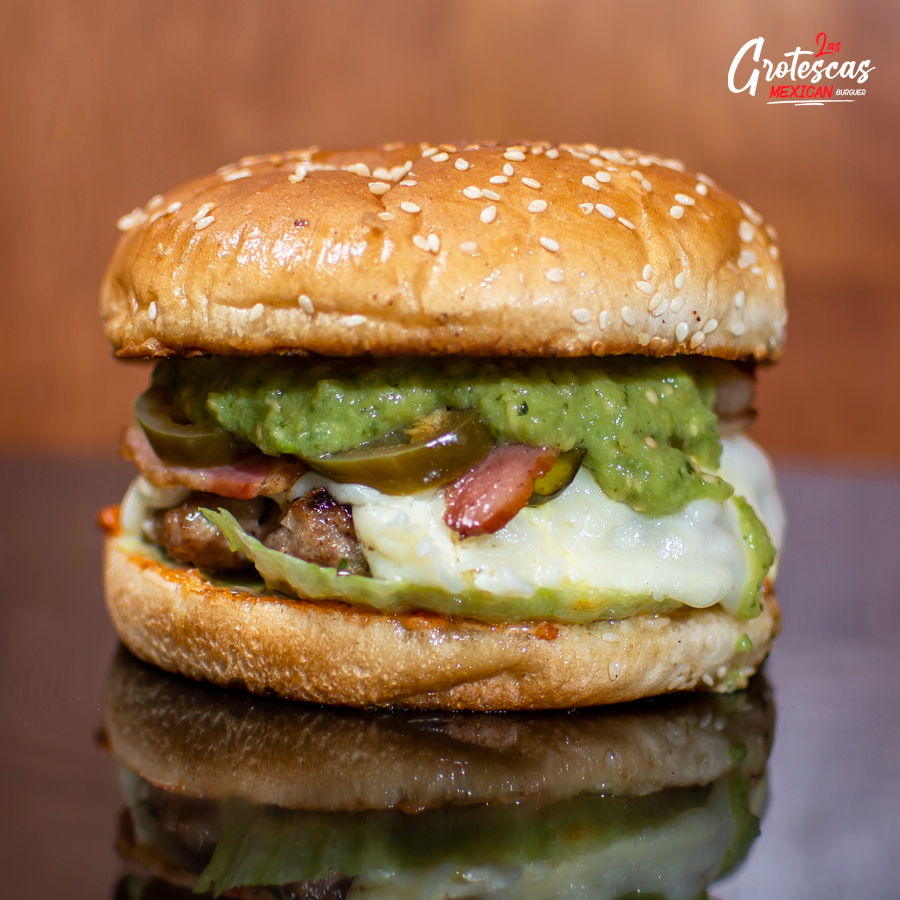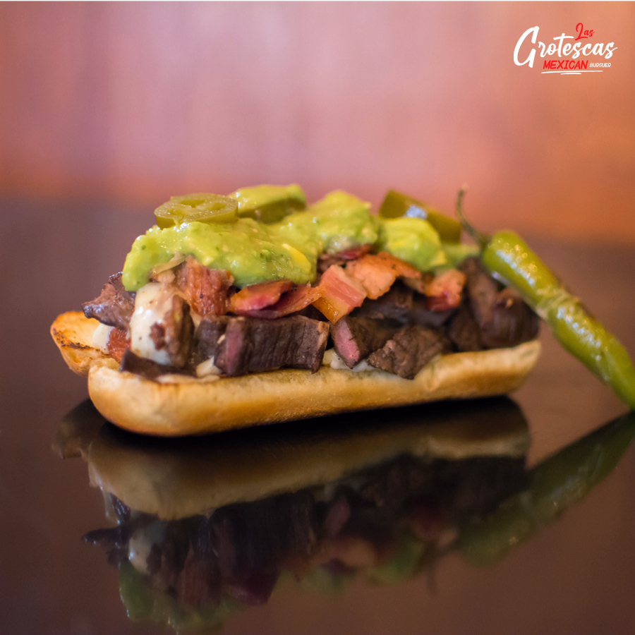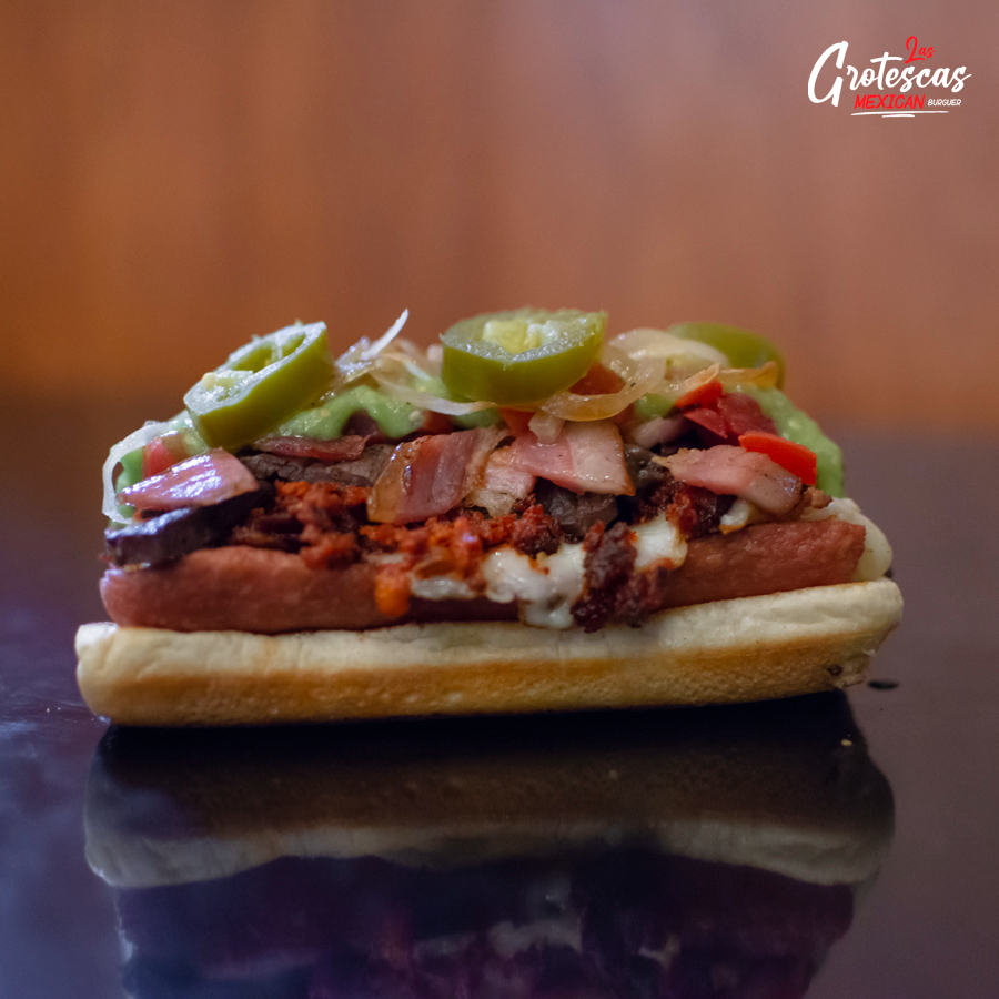 Carne de res, tocino, guacamole, aderezo mil islas, queso asadero, chile jalapeño, pepinillos, lechuga y jitomate.