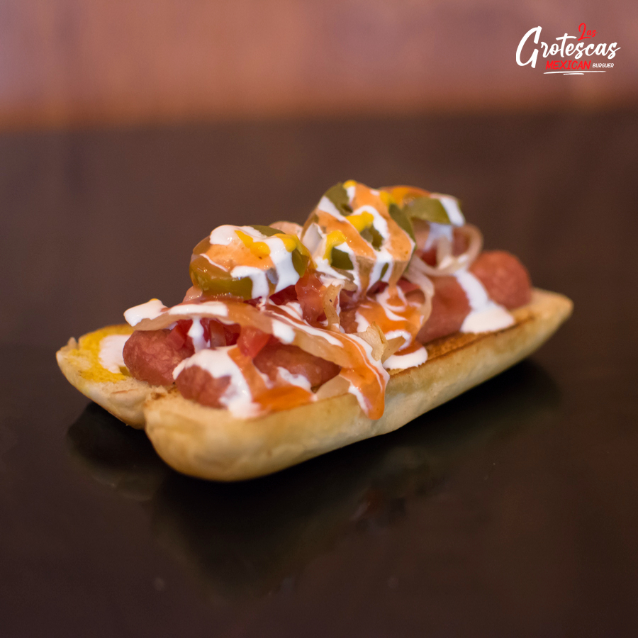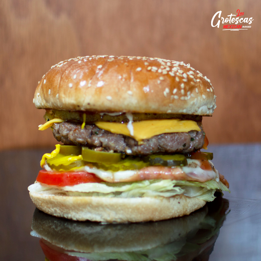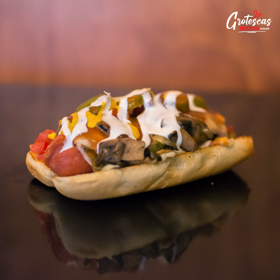 Carne de res, queso amarillo y queso blanco. Chile jalapeño, pepinillos, lechuga, jitomate, catsup, mostaza y crema.