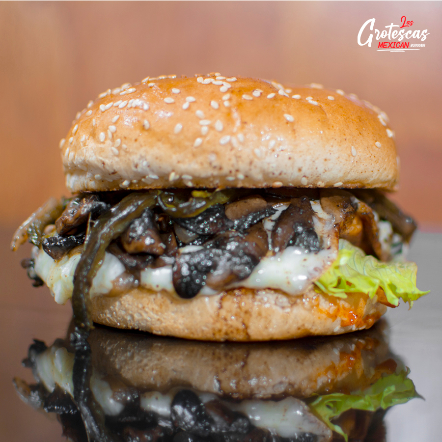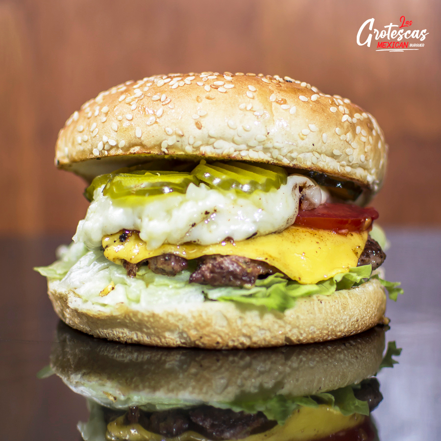 Carne de res, tocino, BBQ, aros de cebolla, queso asadero, chile jalapeño, pepinillos, lechuga y jitomate.