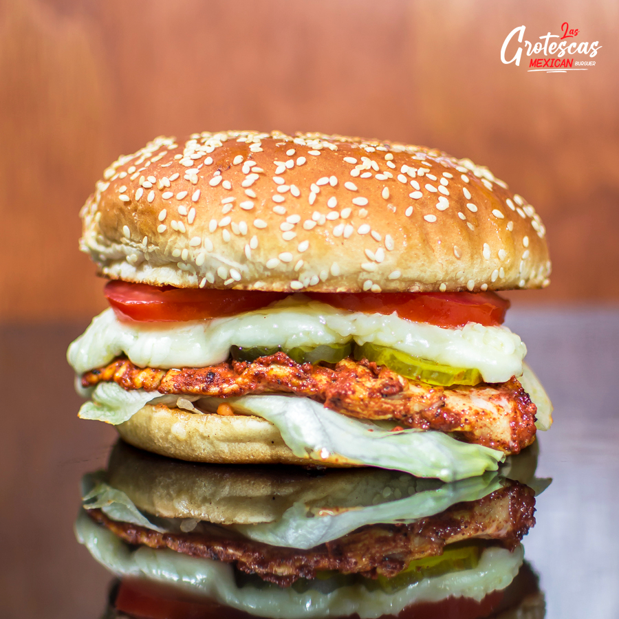 Pollo marinado a la plancha, aderezo mil islas, queso asadero, chile jalapeño, pepinillos, lechuga y jitomate.
