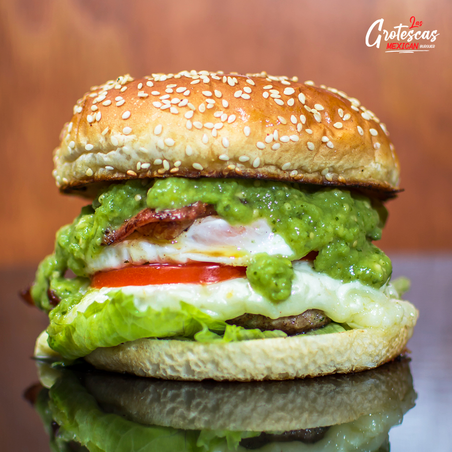 Carne de res, huevo, guacamole, tocino, queso asadero, chile jalapeño, pepinillos, lechuga y jitomate.