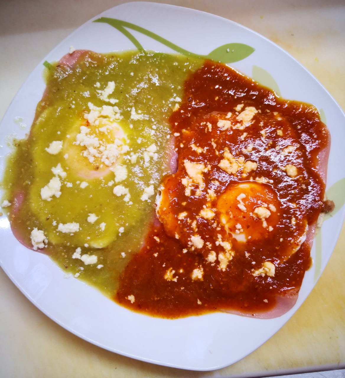 2 Huevos estrellados montados en tortillas de maíz, jamón y bañados en salsa verde y roja acompañados de frijoles.