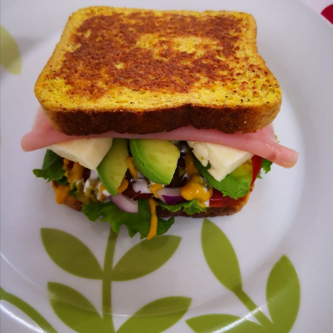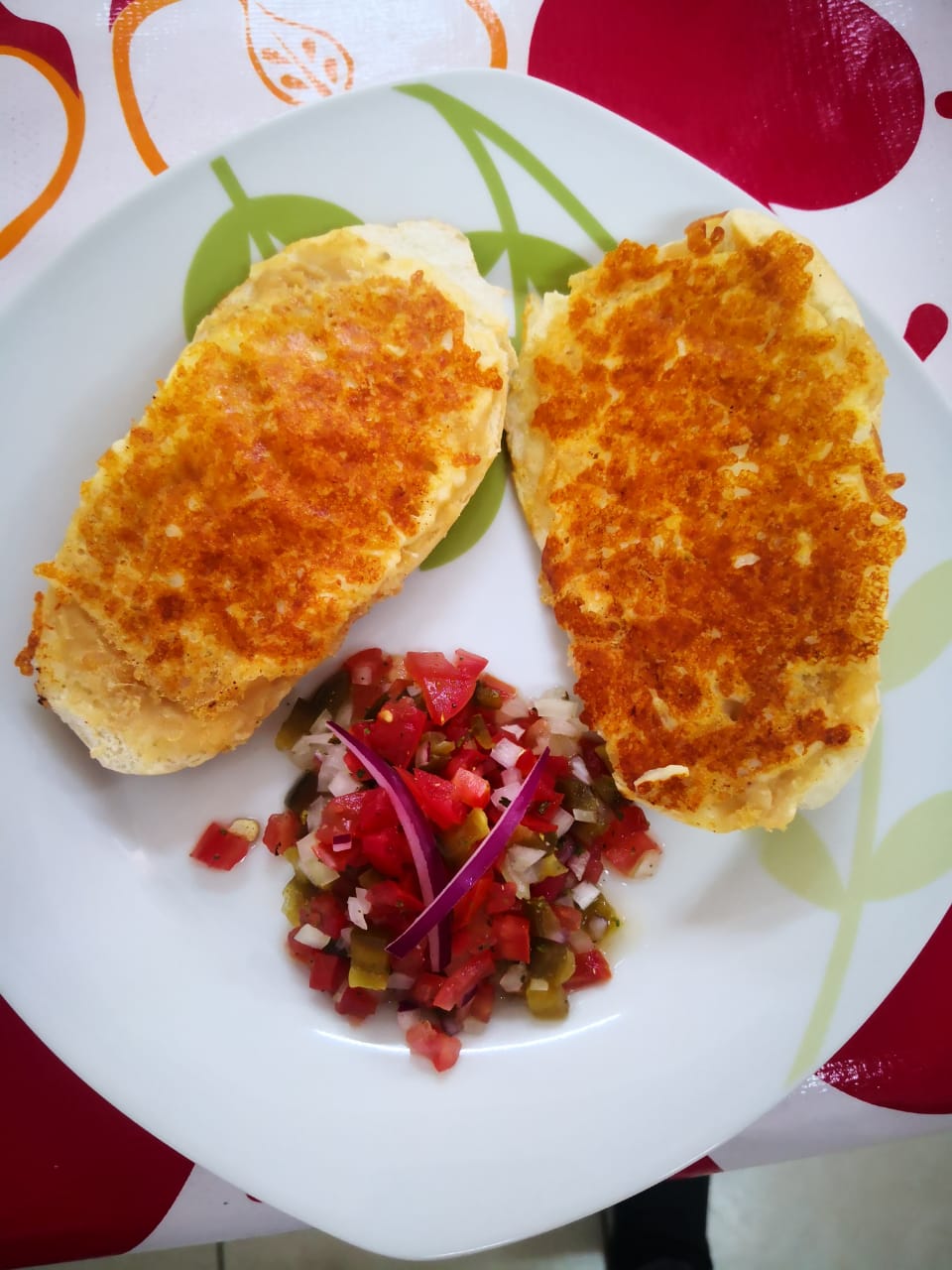 Capeado con huevo, aguacate, queso panela y jamón.