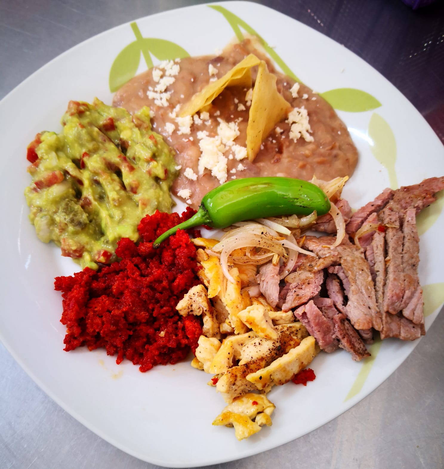 Chorizo, arrachera y pollo, cebolla, chile serrano asado, frijoles, guacamole y 3 quesadillas.
