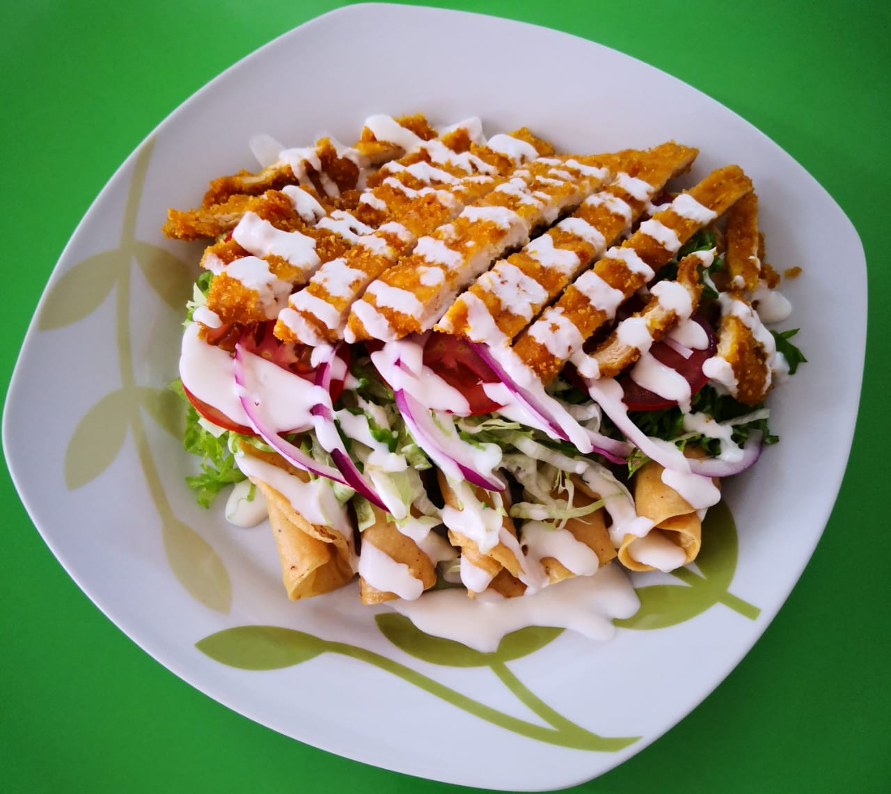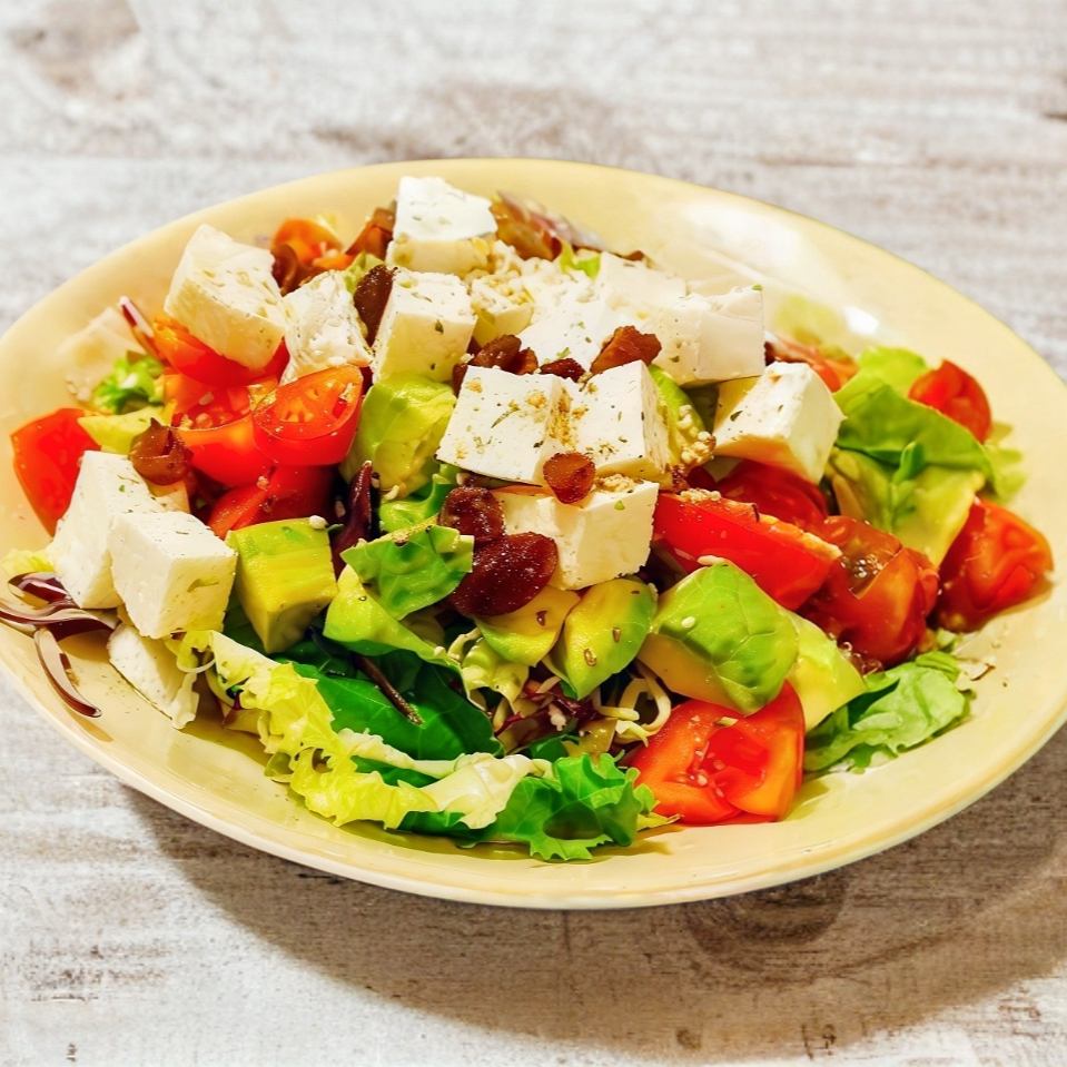 Lechuga, aguacate, jitomate, cebolla, crotones, queso parmesano, aderezo ranch.