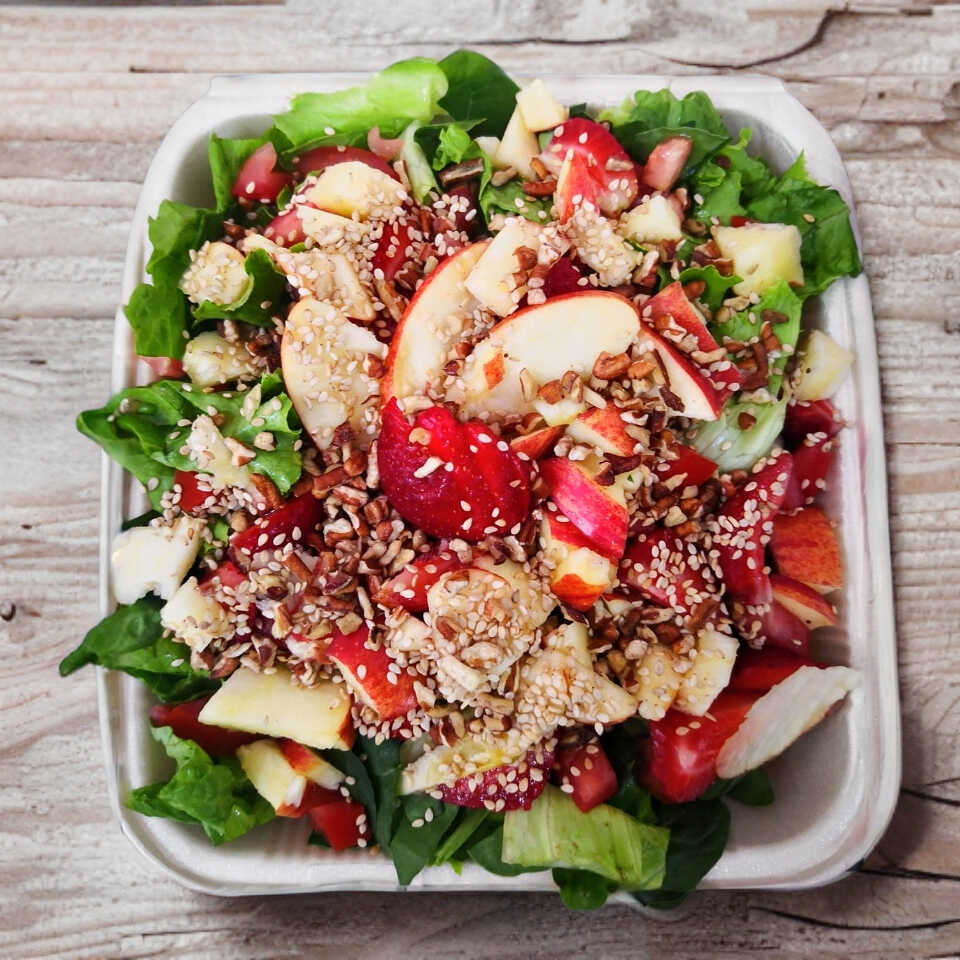 Lechuga, espinaca, fresa, manzana, jitomate, ajonjolí, nuez y aderezo miel mostaza.
