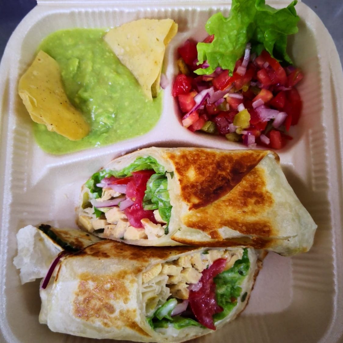 Acompañado de guacamole, pico de gallo y totopos.
