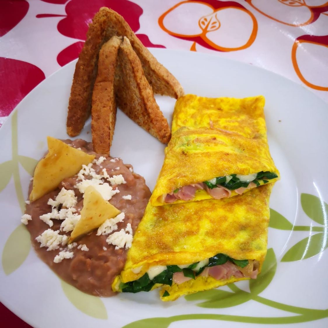 Champiñones, espinacas y jamón acompañados de frijoles, pan integral y salsa.
