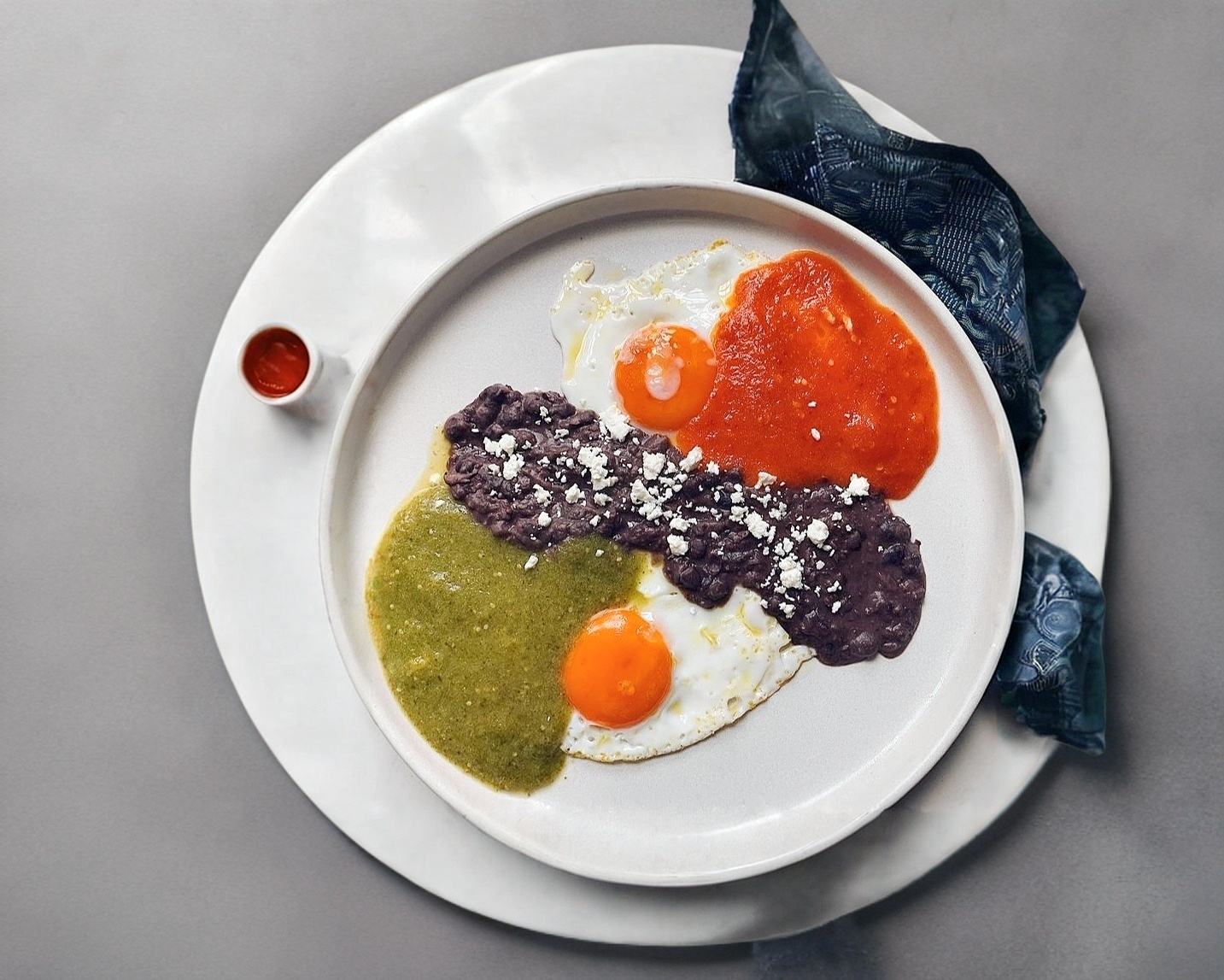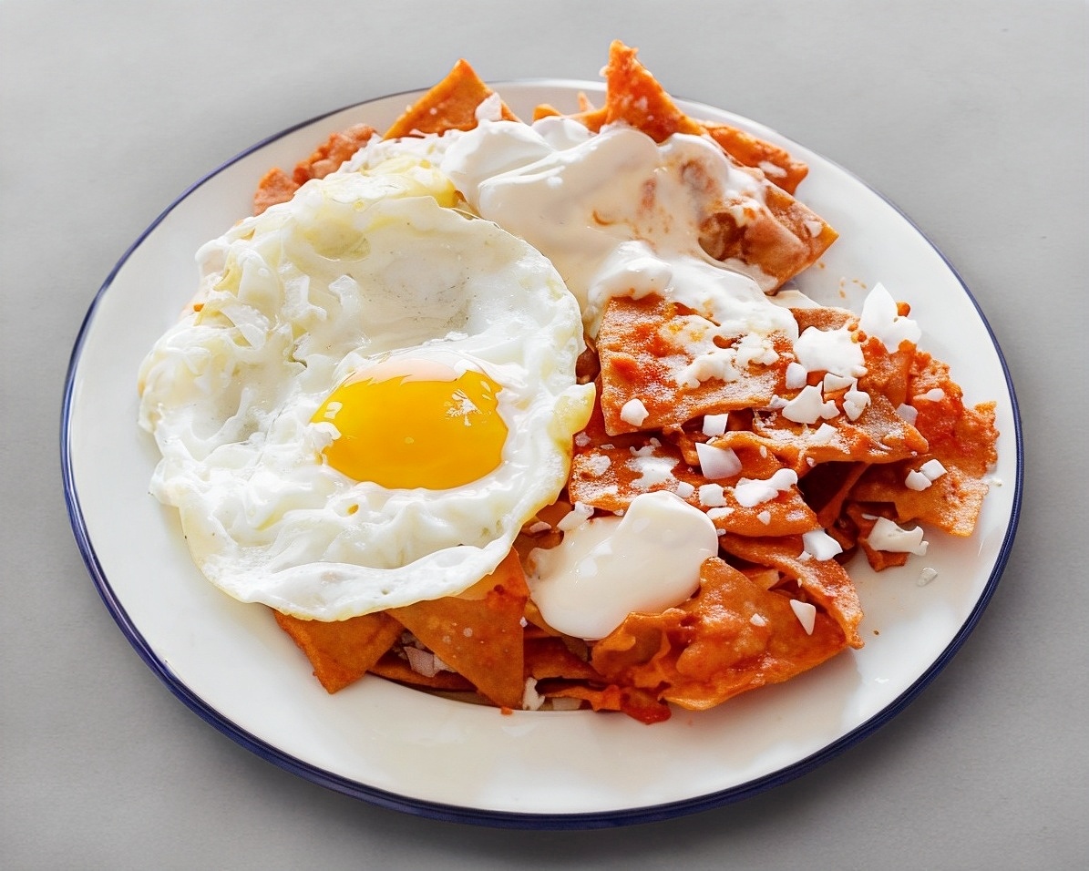 Tortillas de maiz doradas, bañadas en salsa de tomate rojo, acompañadas de cebolla, crema, queso fresco, frijoles y un huevo al gusto acompañados con una pieza de bolillo