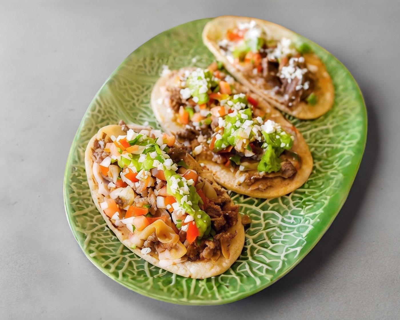 Acompañados de un guisado de su elección, lechuga, jitomate, cebolla, crema y queso
