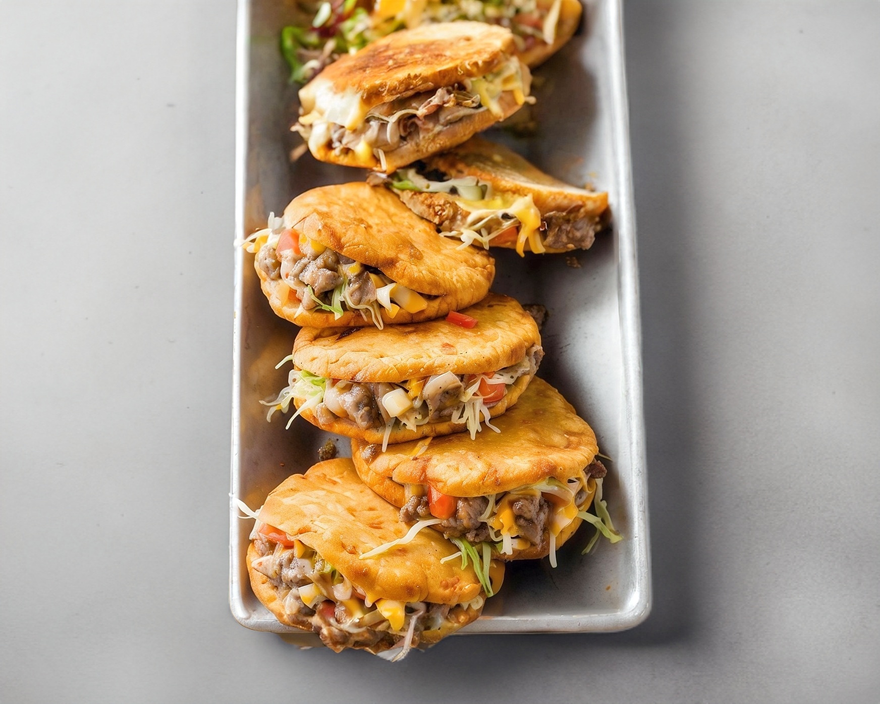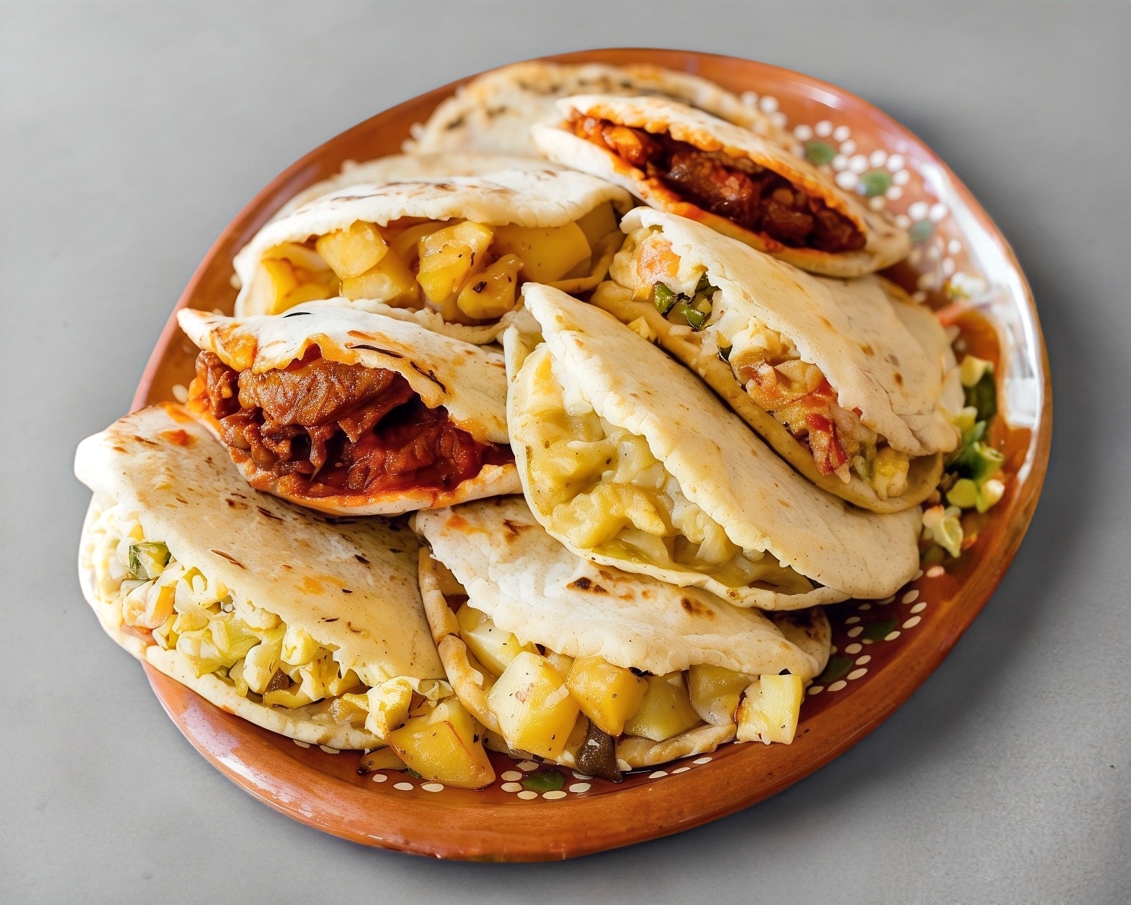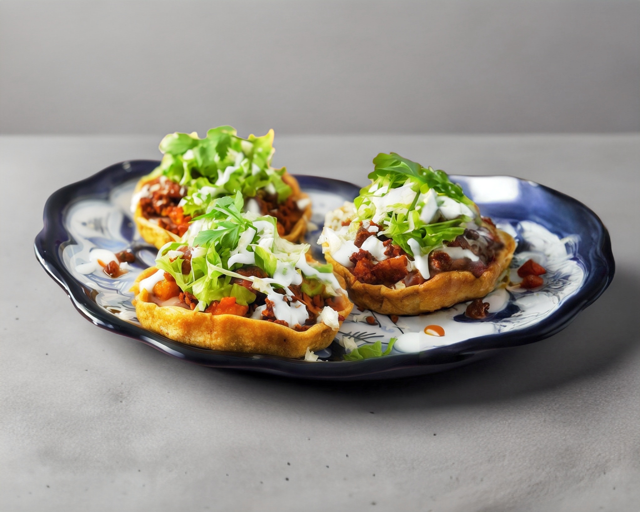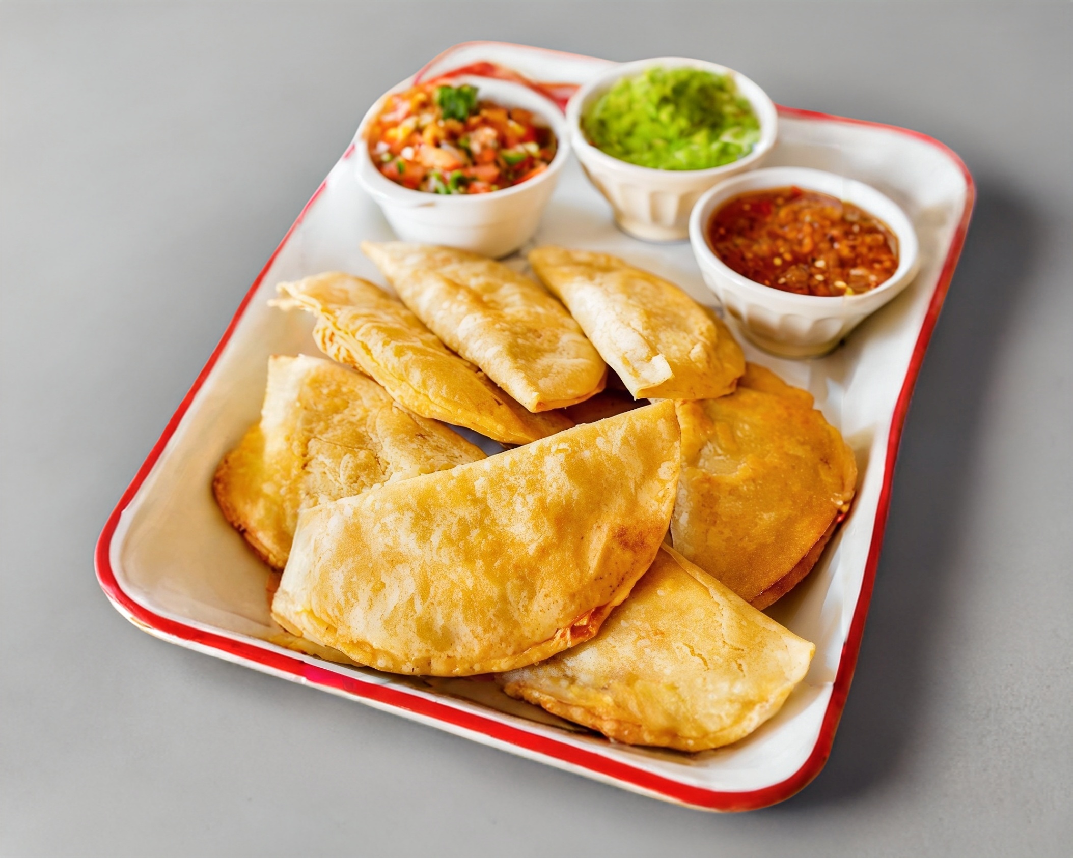 2 piezas rellenas de papa, 2 piezas rellenas de picadillo, acompañados con lechuga, jitomate, cebolla, crema y queso rallado