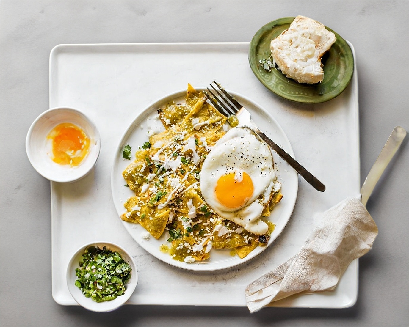 Tortillas de maiz doradas, bañadas en salsa de tomate verde, acompañadas de cebolla, crema, queso fresco, frijoles y un huevo al gusto acompañados con una pieza de bolillo