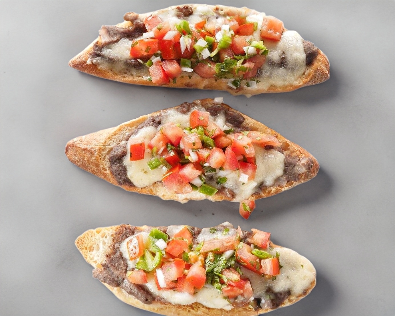 3 mitades de bolillo con frijoles y queso gratinado, acompañados de salsa bandera (jitomate, cebolla y chile serrano picados)