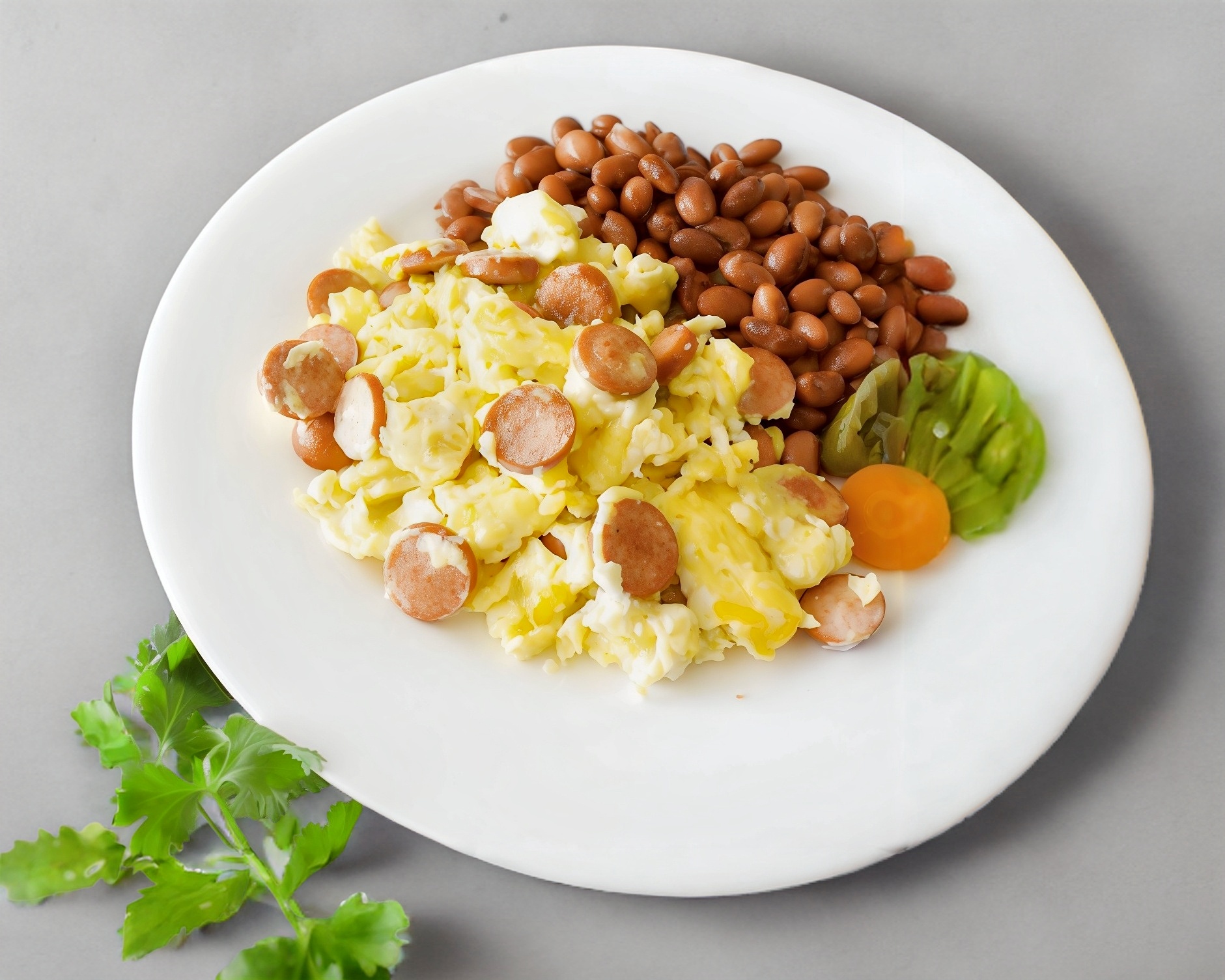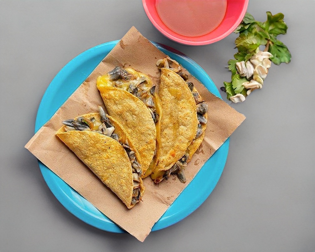 Relleno con queso Oaxaca, jitomate y cebolla picado, acompañados de frijoles y ensalada de lechuga