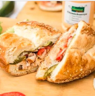 Torta caliente en plancha con mantequilla, bolillo tradicional de León, salchicha de pavo, jitomate, cebolla desflemada en vinagre, chiles en vinagre, aguacate y mayonesa de la casa.