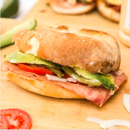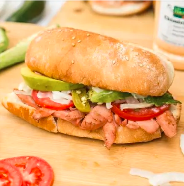 Torta caliente en plancha con mantequilla, bolillo tradicional de León, porción de jamón de pierna y salchicha de pavo, jitomate, cebolla desflemada en vinagre, chiles en vinagre, aguacate y mayonesa de la casa.