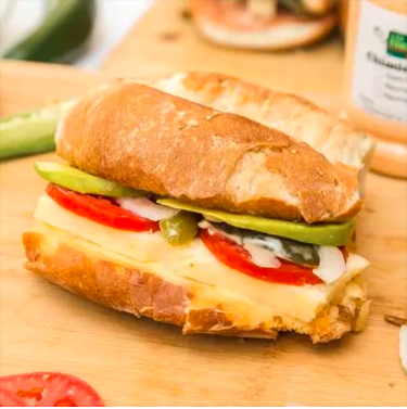 Torta caliente en plancha con mantequilla, bolillo tradicional de León, Queso Blanco, jitomate, cebolla desflemada en vinagre, chiles en vinagre, aguacate y mayonesa de la casa.