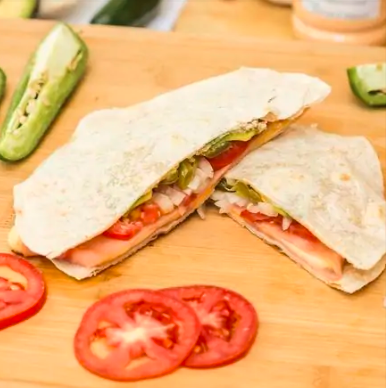 Sincronizada caliente en plancha con mantequilla, dos tortillas de harina, porción de jamón queso blanco y queso amarillo, jitomate, cebolla desflemada en vinagre, chiles en vinagre, aguacate y mayonesa de la casa.