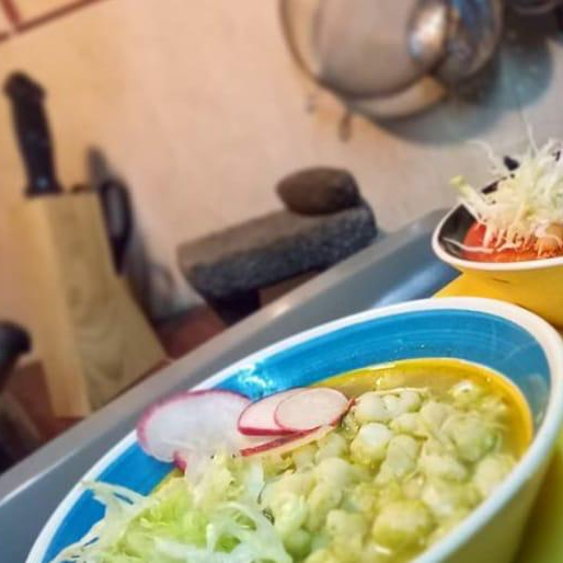 1/2 Litro pozole verde de pollo incluye tostadas, verdura y salsa.