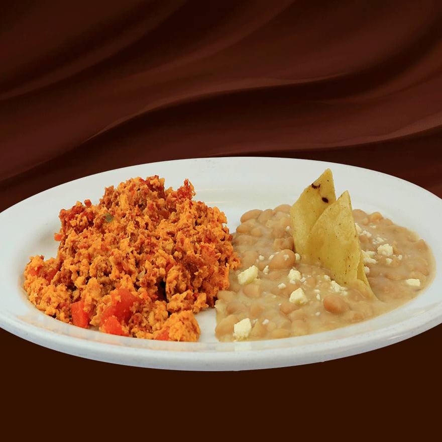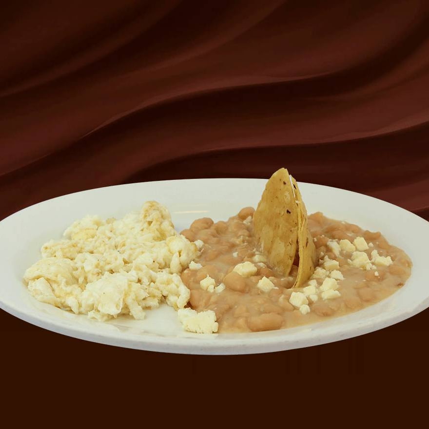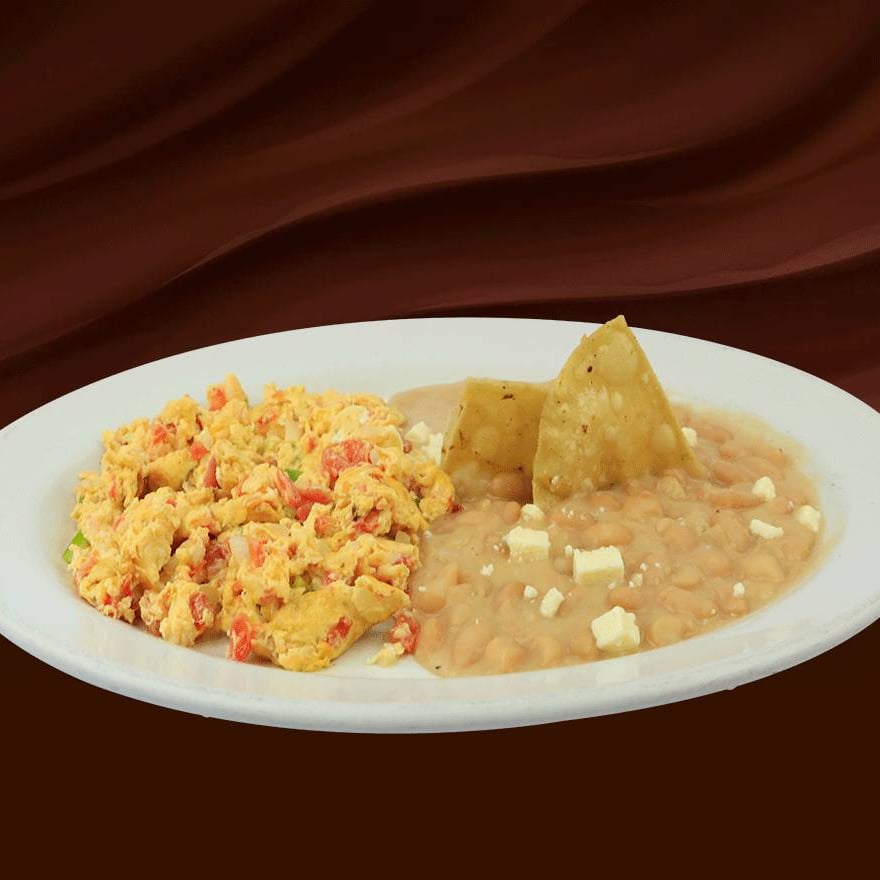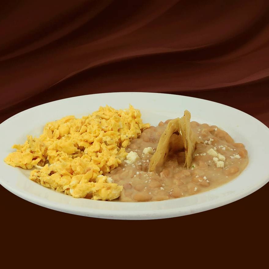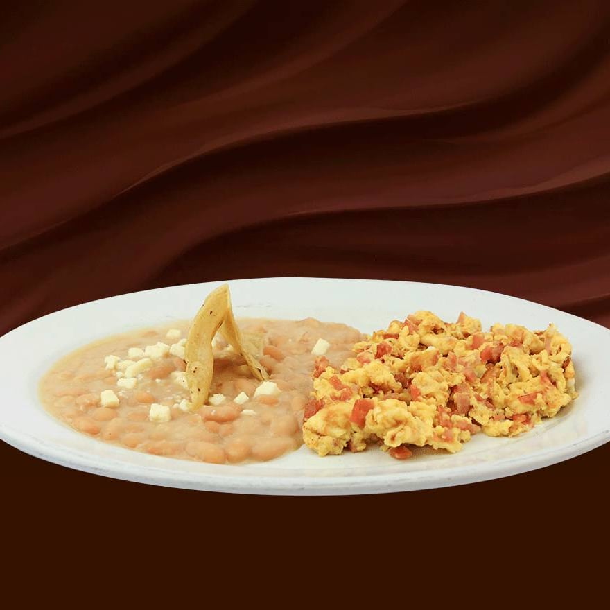 Dos huevos revueltos al gusto preparado con dos ingredientes: jamón, salchicha, tocino, chorizo, champiñones, jitomate, cebolla o pimiento morrón amarillo, con frijoles refritos. Con tres tortillas de comal hechas a mano.