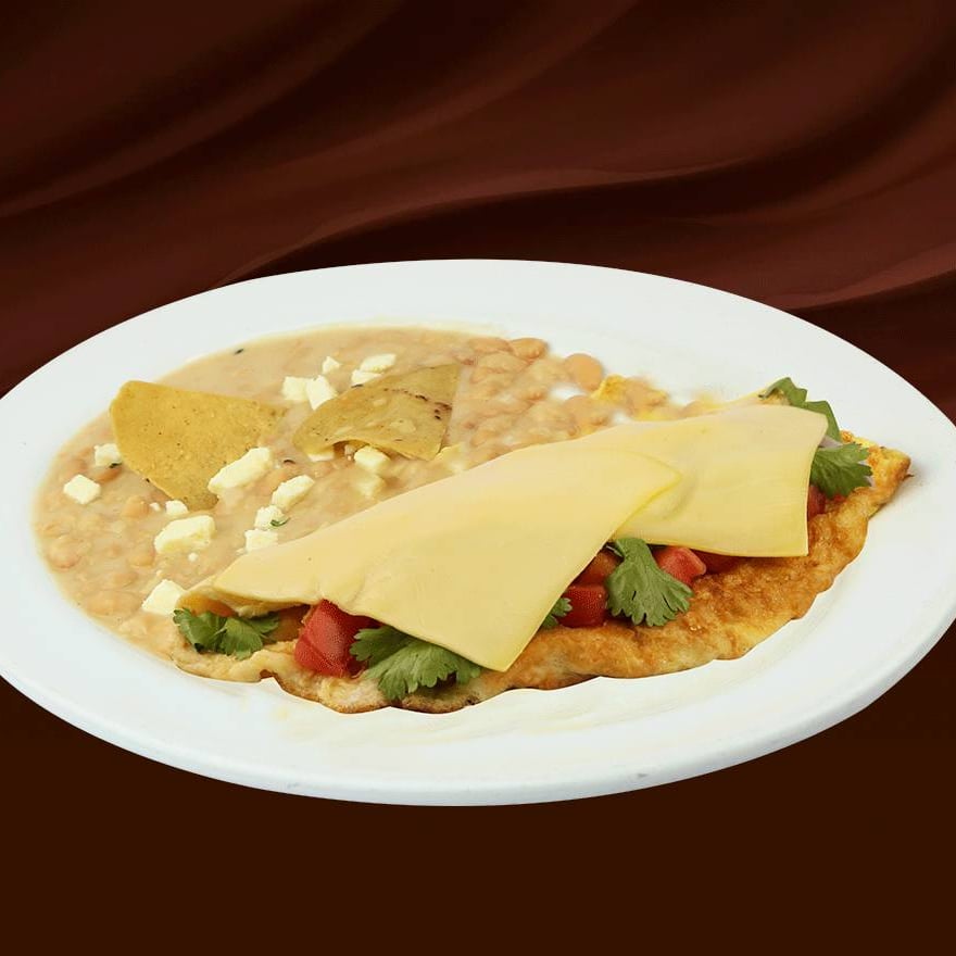 Omelette de dos huevos con queso mozarella gratinado preparado con tres ingredientes a tu gusto: jamón, salchicha, tocino, chorizo, champiñones, jitomate, cebolla, pimiento morrón amarillo, con frijoles refritos. Con tres tortillas de comal.