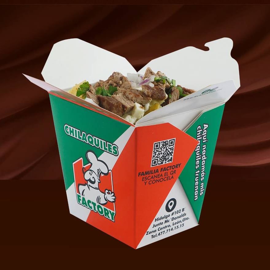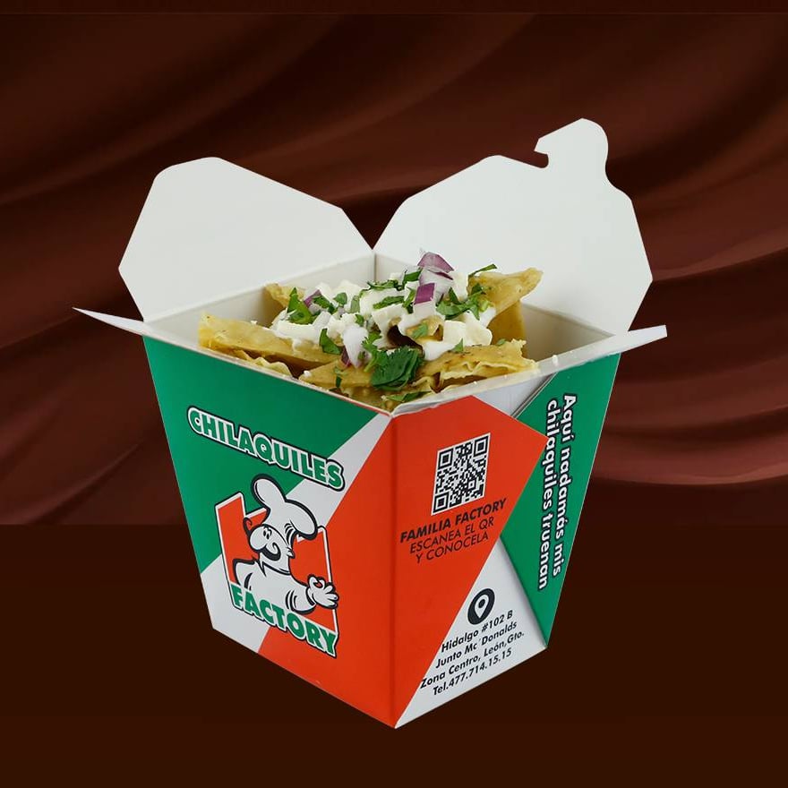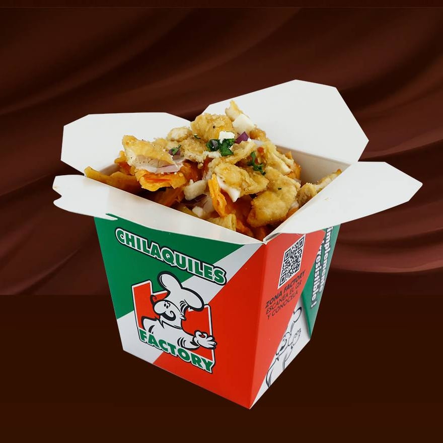 Deliciosos chilaquiles en presentación cajita con cebollita, cilantro, crema y queso fresco.